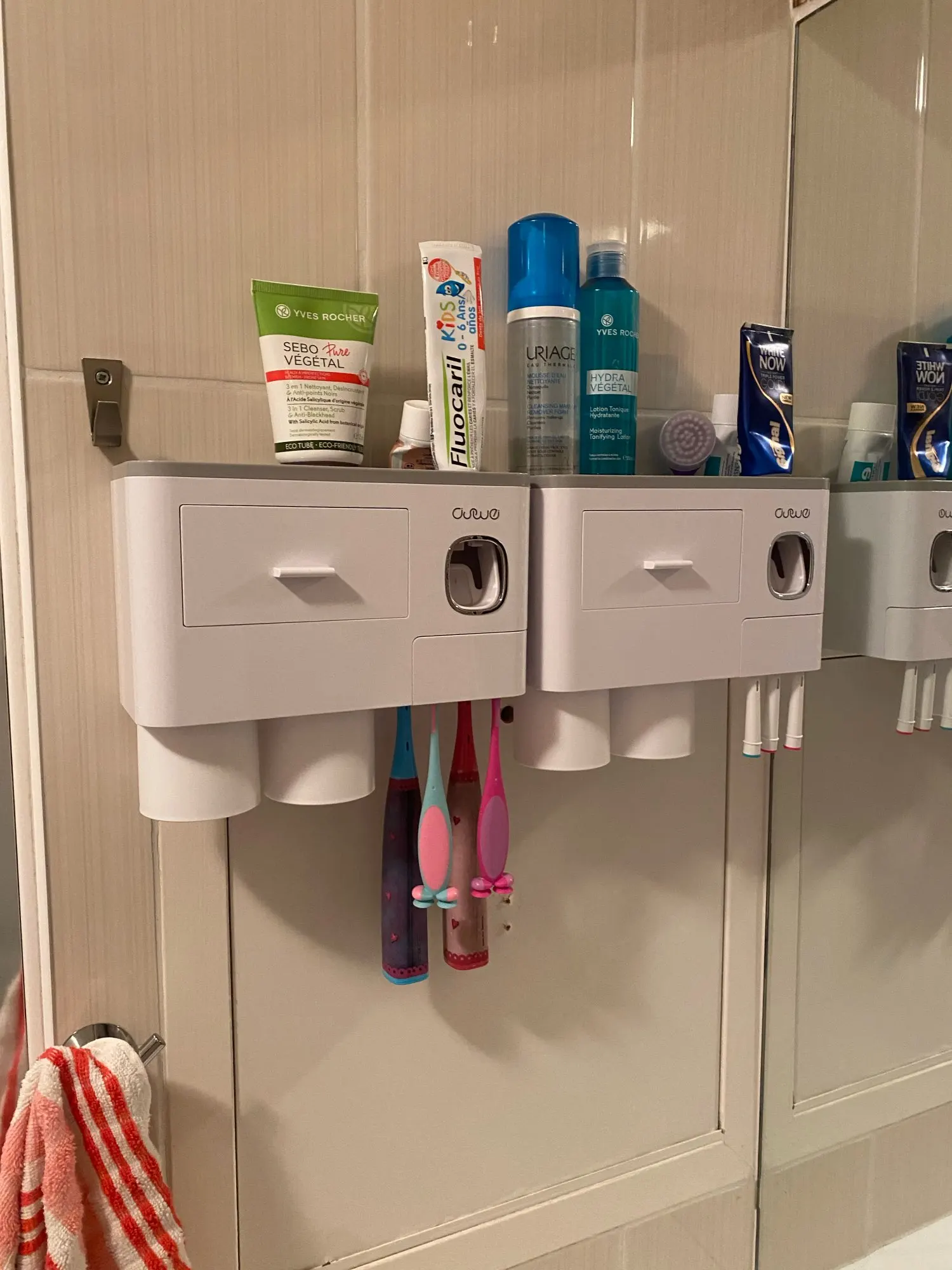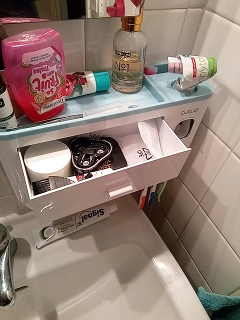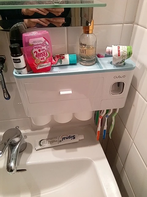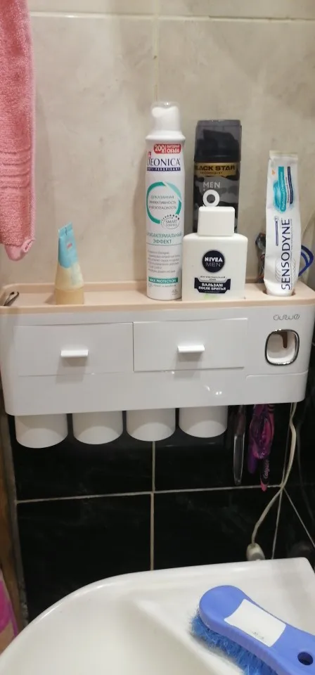 Супер полезные готовые кисти, зубная паста .. На раковине. Хороший дизайн, ультра липкий клей, по крайней мере, на плитке, я рекомендую :-)
