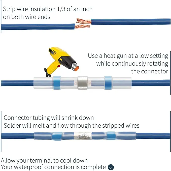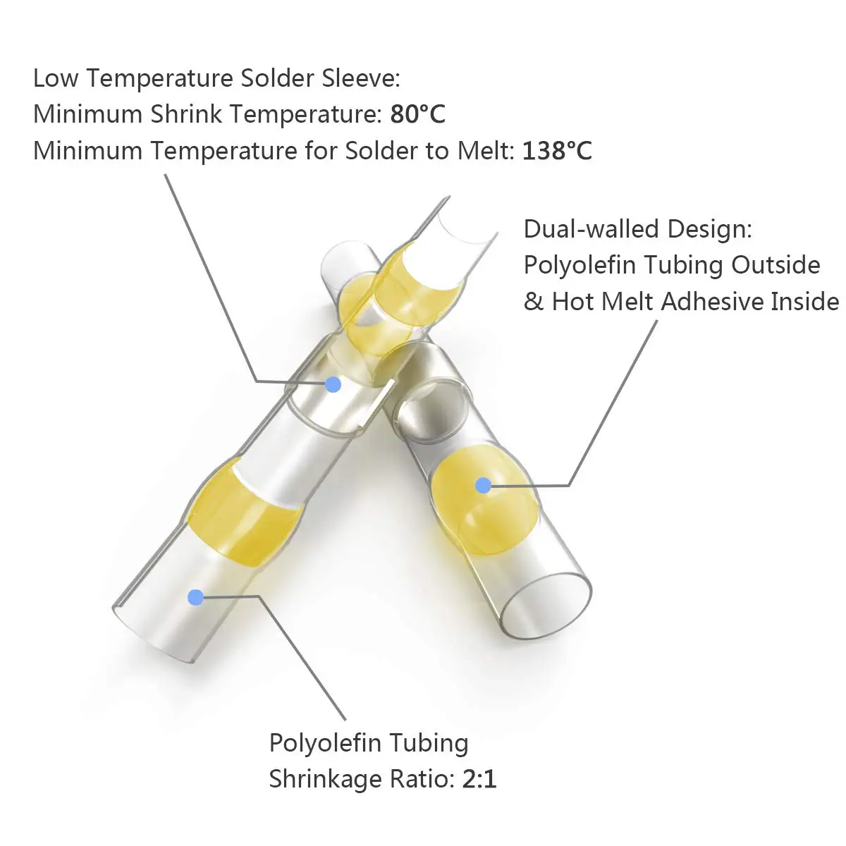 Диапазон рабочих температур:● Минимальная температура припоя для расплава: 138 °C● Минимальная температура сжатия: 80 °C● Рабочая температура:-55 ℃ - 125 ℃● Температура сжатия: >160 ℃ Спецификация:★Цвет: желтый, синий, красный, белый.Особенности:★Коэффициент усадки составляет 2:1★Двухстенные трубки: полиолефиновые трубки снаружи и термоплавкий клей внутри★Цветная Соединительная трубка★Термоактивированный водонепроницаемый клей★Низкотемпературный паяльный рукав★Припой и термоплавкий клей внутри могут быть идеально водонепроницаемыми.★Водонепроницаемые Паяные соединители предотвращают коррозию проводов.