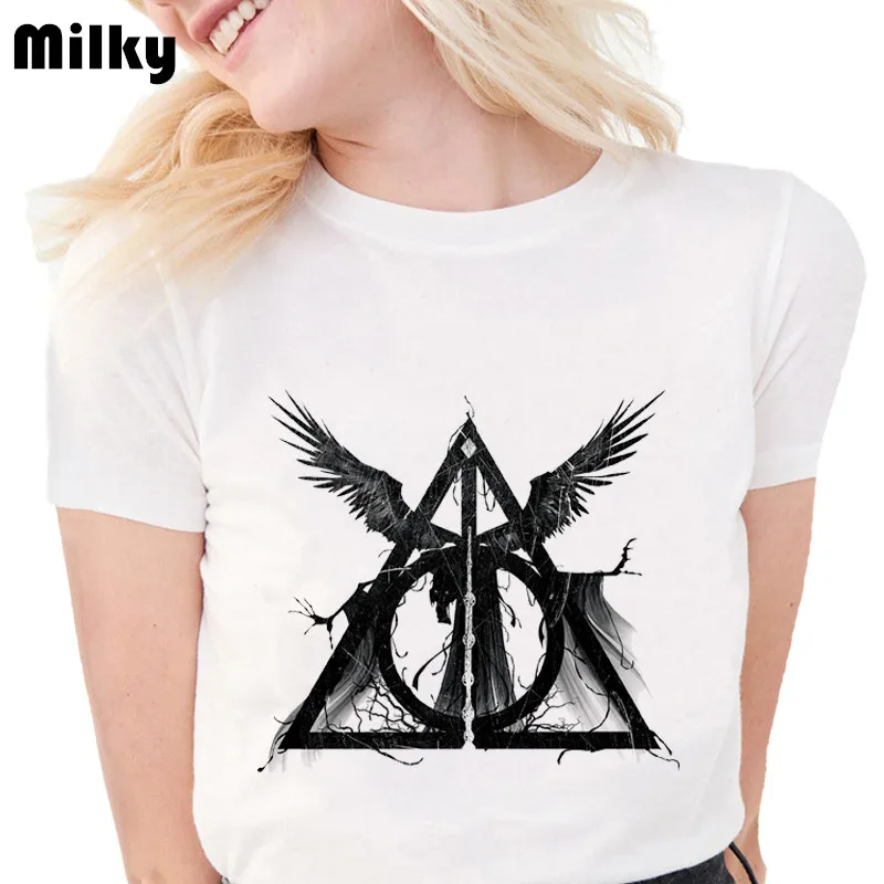 Новые модные дизайнерские футболки Deathly Hallows, топы с принтом, женская футболка, тонкие повседневные топы белого размера плюс с принтом Three Brothers Tale
