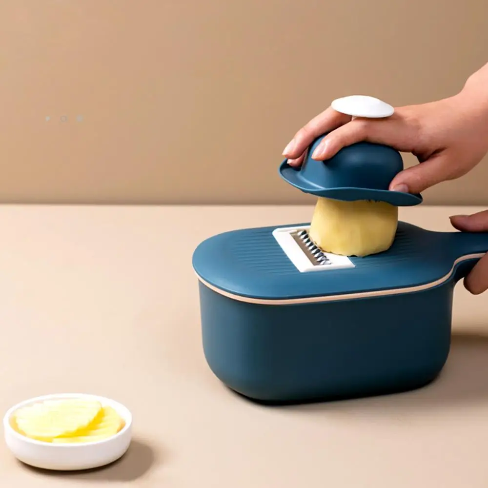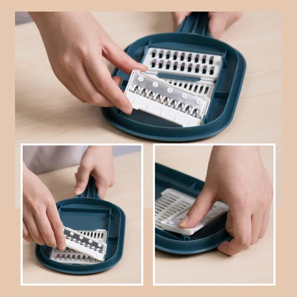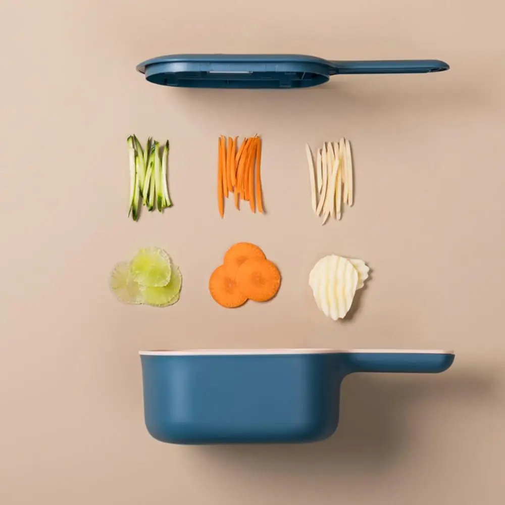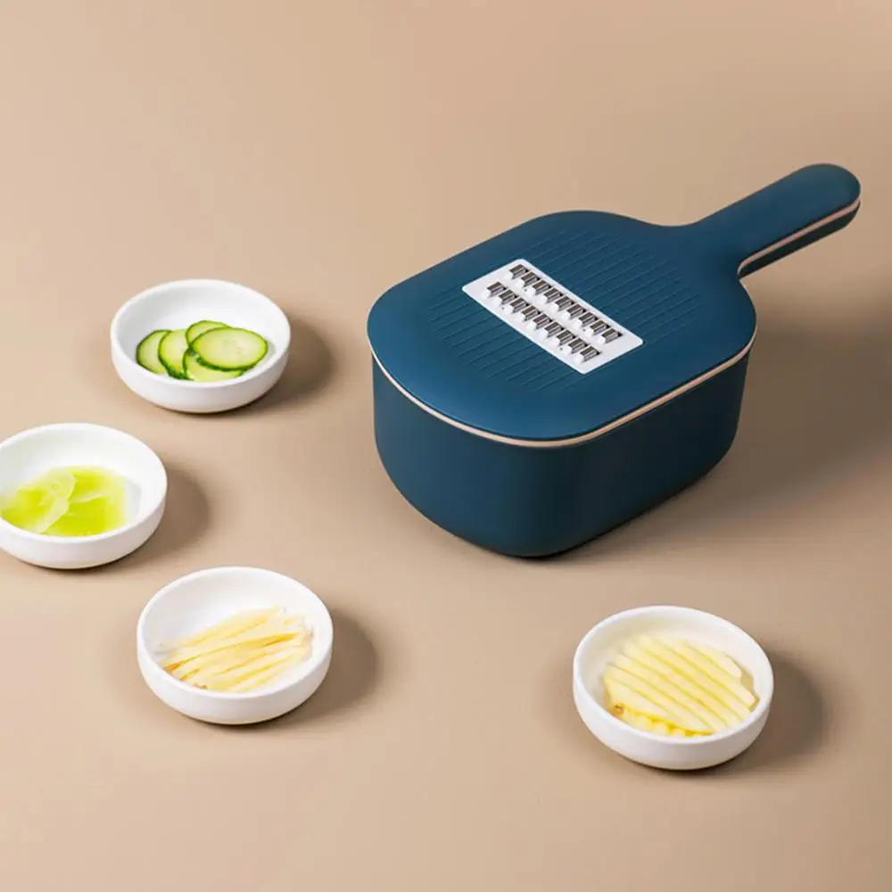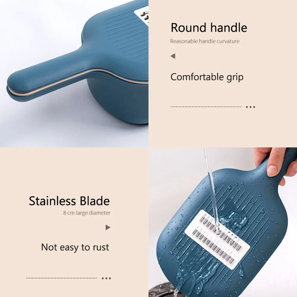 -Многофункциональное сочетание, простота в эксплуатации, компактность и не занимает территорию.-Четыре вида лезвий, вкусные и бесплатные.-4 мм толстая проволока, подходит для холодной жареной посуды.-Нить 3 мм похожа на большой кухонный нож.-Нарежьте ломтики, толщина ингредиентов ровная, так что приготовление пищи может быть равномерно нагревается.-Защита рук позволяет избежать царапин на руках.-Использование полипропиленового материала, безопасного и здорового, через несколько проверок гигиены пищевых продуктов.-На задней части верхней крышки есть несколько резцов, которые можно использовать для хранения лезвий.