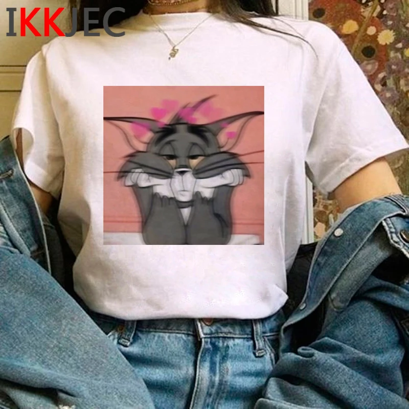 Футболка женская с забавным рисунком кота и мышки, милая аниме футболка в стиле Харадзюку, уличная одежда с милым графическим рисунком