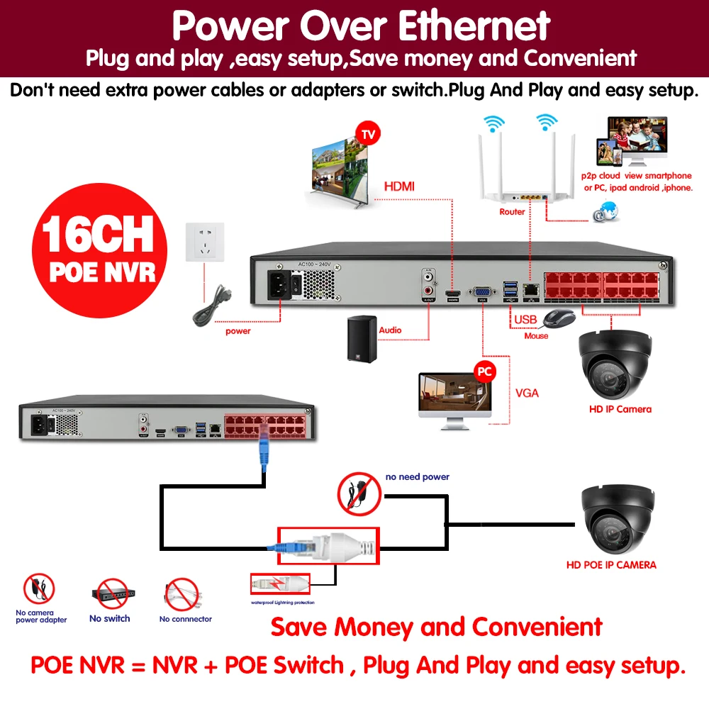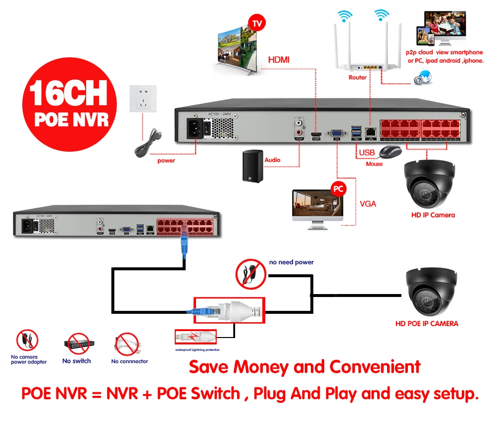 Нет дополнительных кабелей питания или адаптеров, просто подключив ip-камеру к NVR с помощью одного кабеля, вы можете легко завершить установку без знания о компьютере или сети и начать наслаждаться супер простым мониторингом среди вашего смартфона, планшета или ПК.