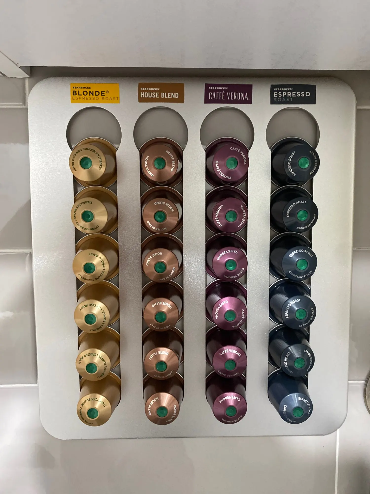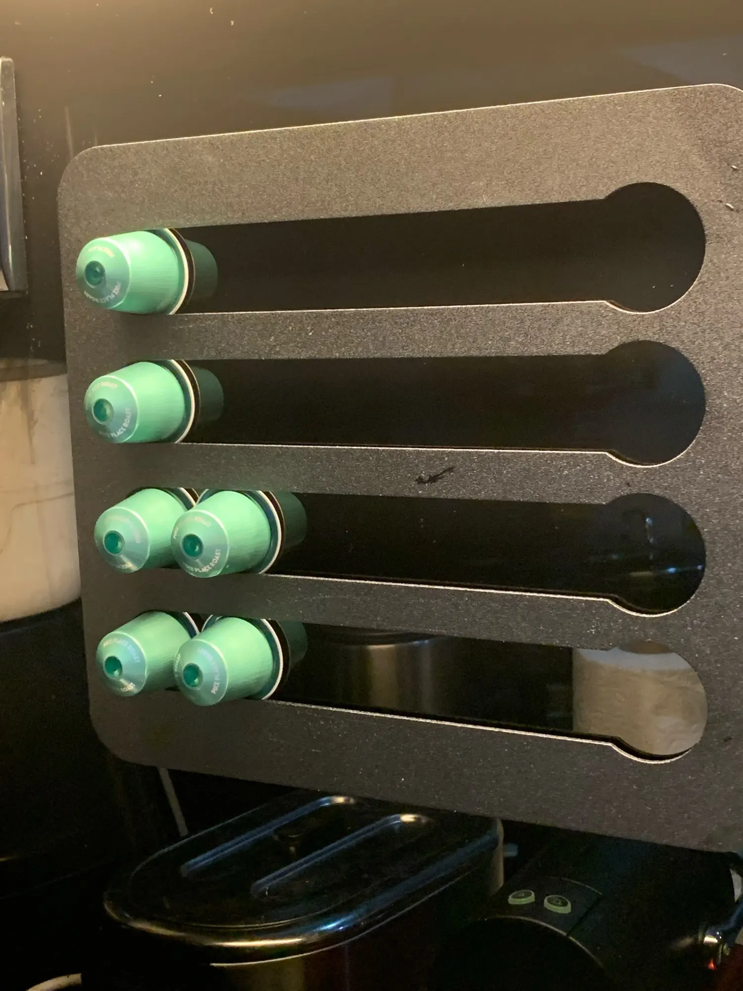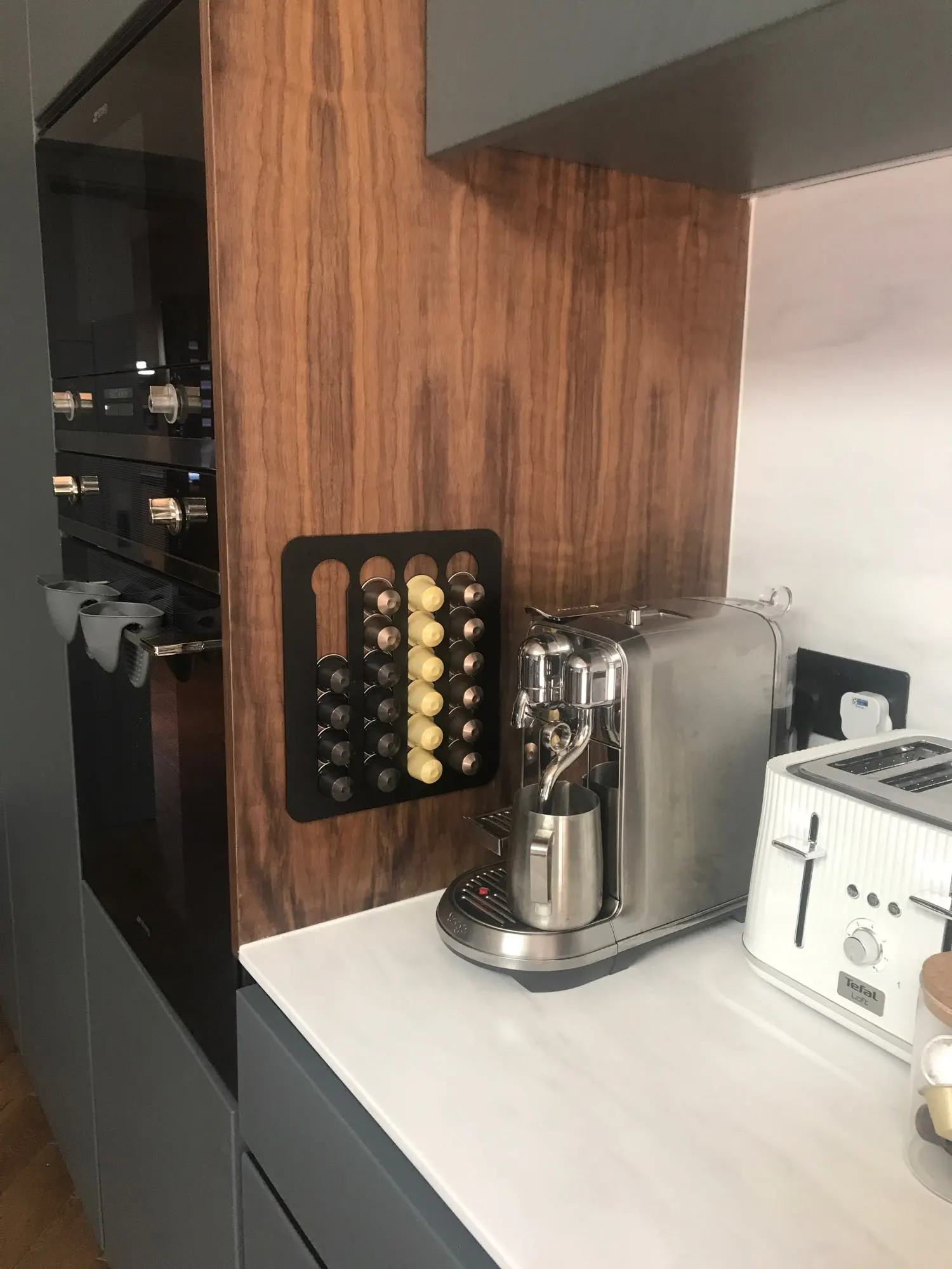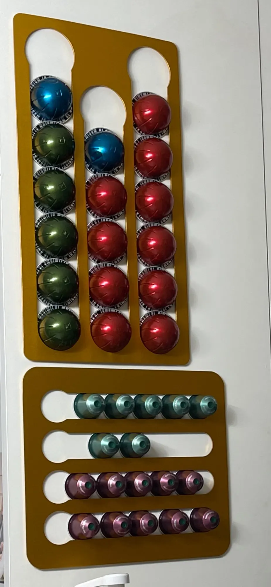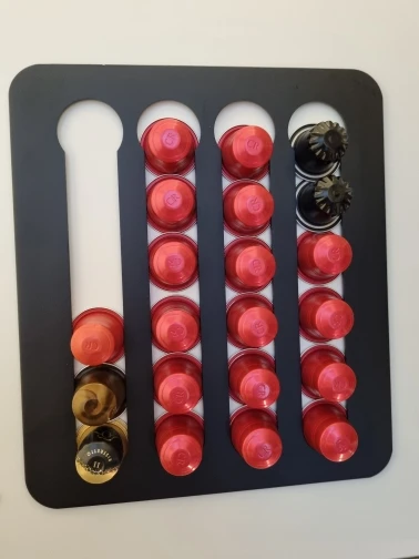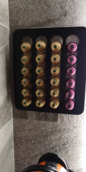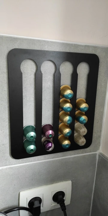 Очень практично. Он идеально подходит к стене. Это не занимает места, и капсулы скользят идеально.