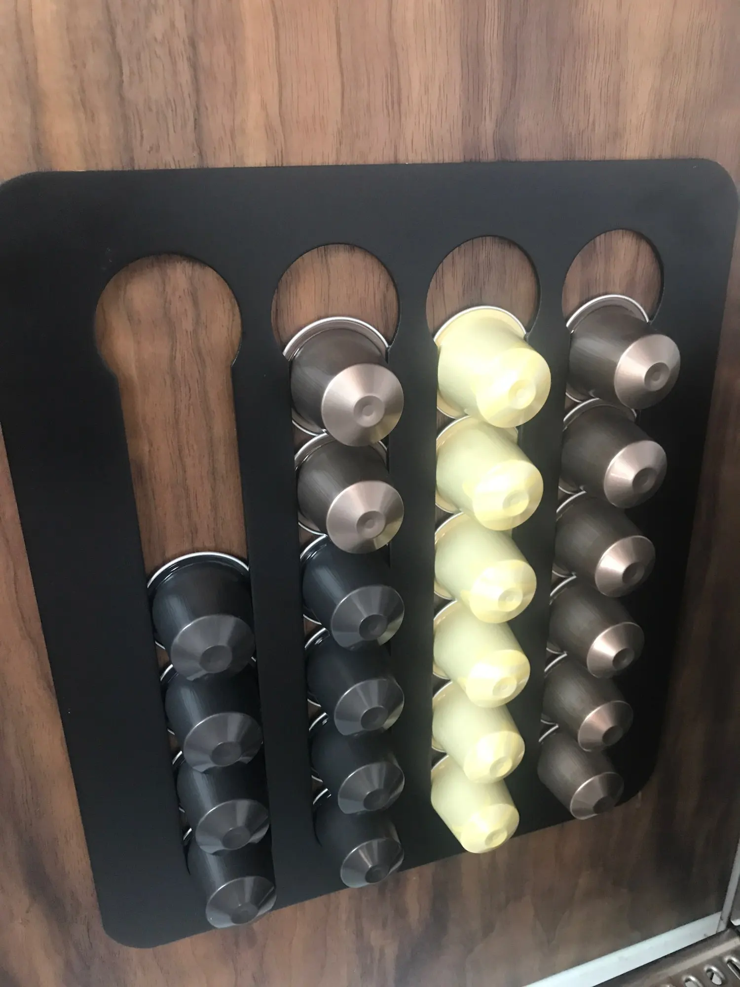 The item is as described, however the sticky pads could be a fraction thicker, as the Nespresso caps need a fraction more space to slide in freely. I had to bend the unit out slightly as the caps caused the item to pop the sticky pads away from surface. BUT this is a minor issue and the unit is now fine.