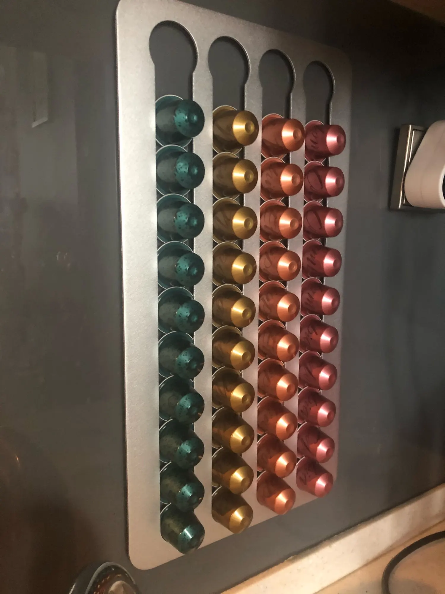 Достаточно полезный аксессуар для экономии картонных коробок внутри шкафа и наличия капсул вручную. Я проверил, что с капсулами марки L'Or, они очень плотно прилегают, и рекомендуется нанести двойную клейкую пену, чтобы получить марген и капсулу без проблем, от другого белого бренда нет проблем. Эль. Доставка была произведена. Внутри. Срок, указанный.