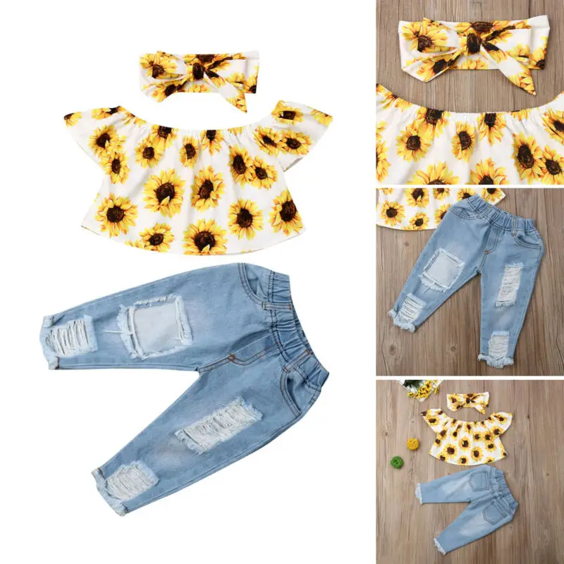 Новинка лета 2020, Модный милый комплект одежды для маленьких девочек, топ с открытыми плечами и рваные джинсовые брюки принцессы, детская одежда, хлопковая одежда