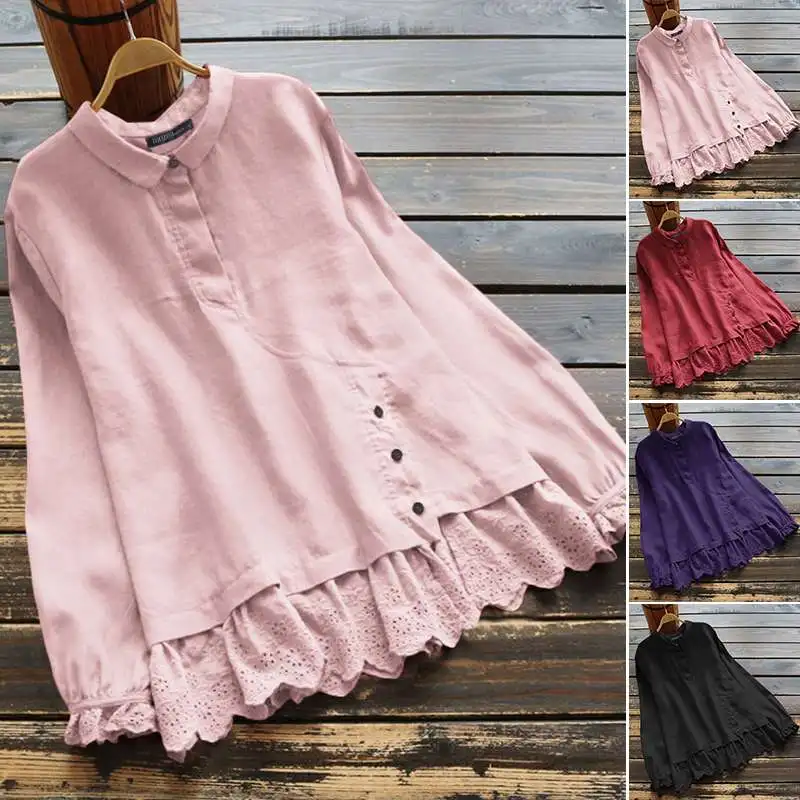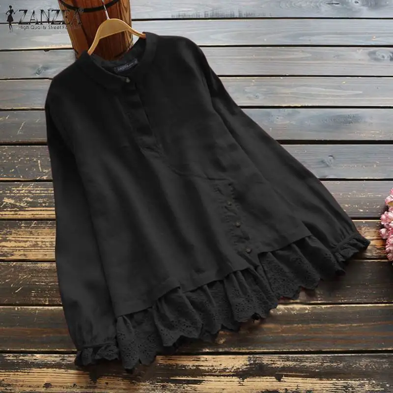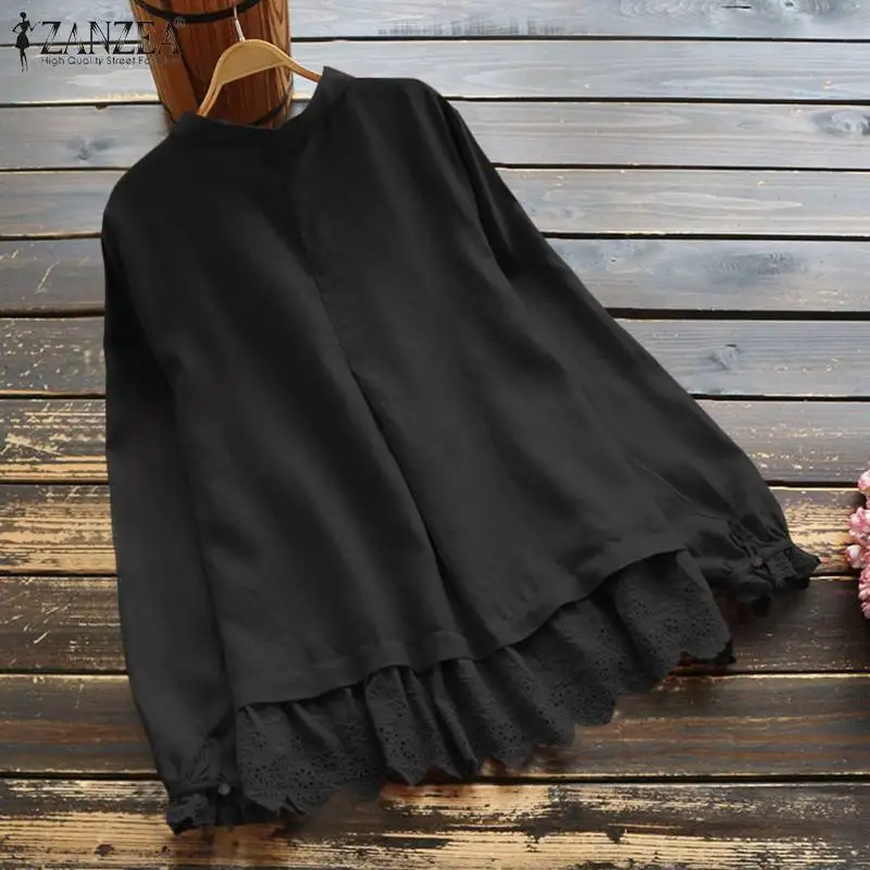 Рубашка ZANZEA Женская хлопково-льняная с длинным рукавом, винтажная кружевная блузка в стиле пэчворк, свободная однотонная туника, топ, на весну