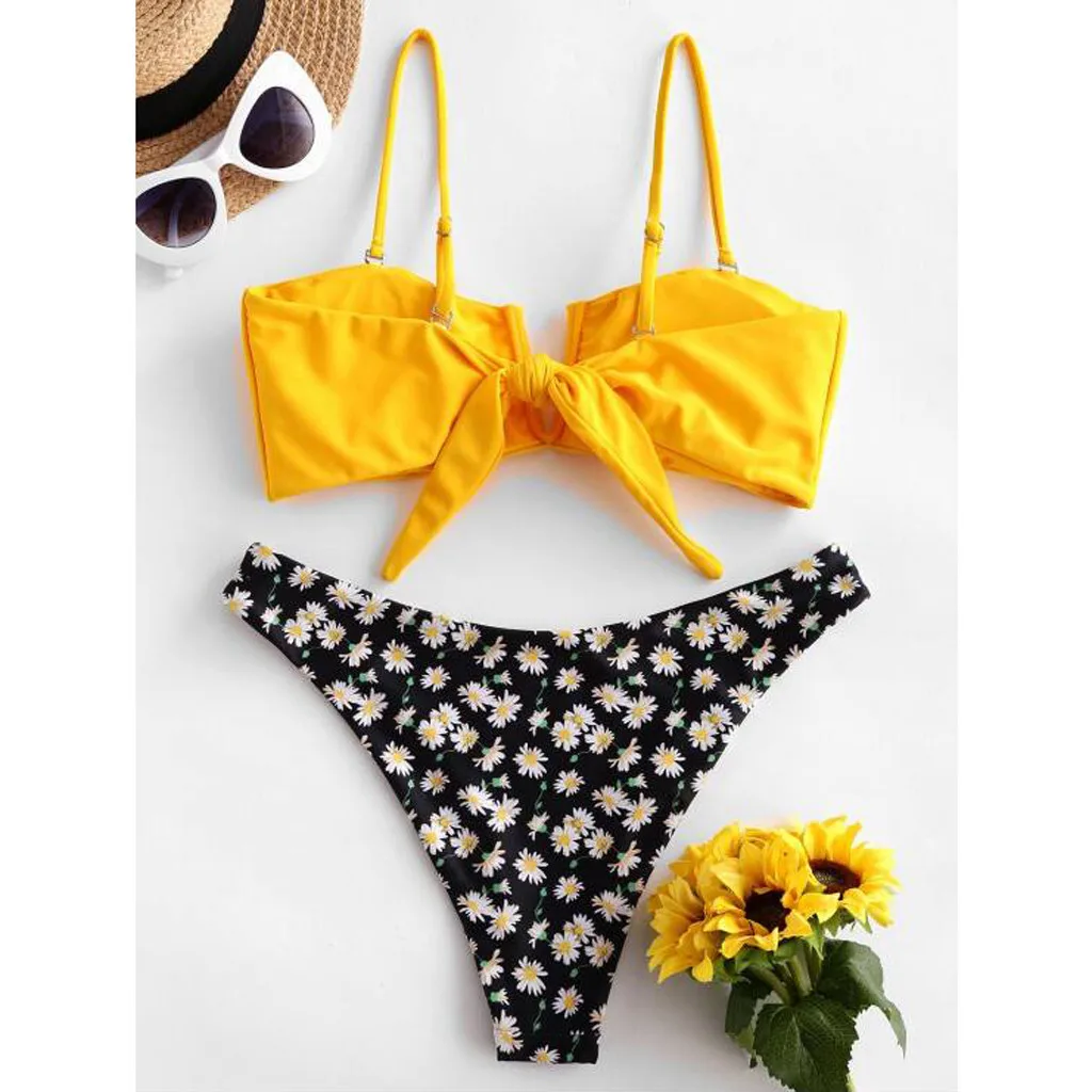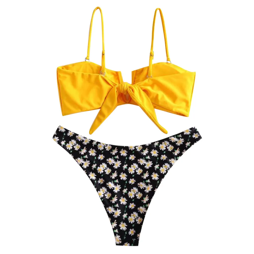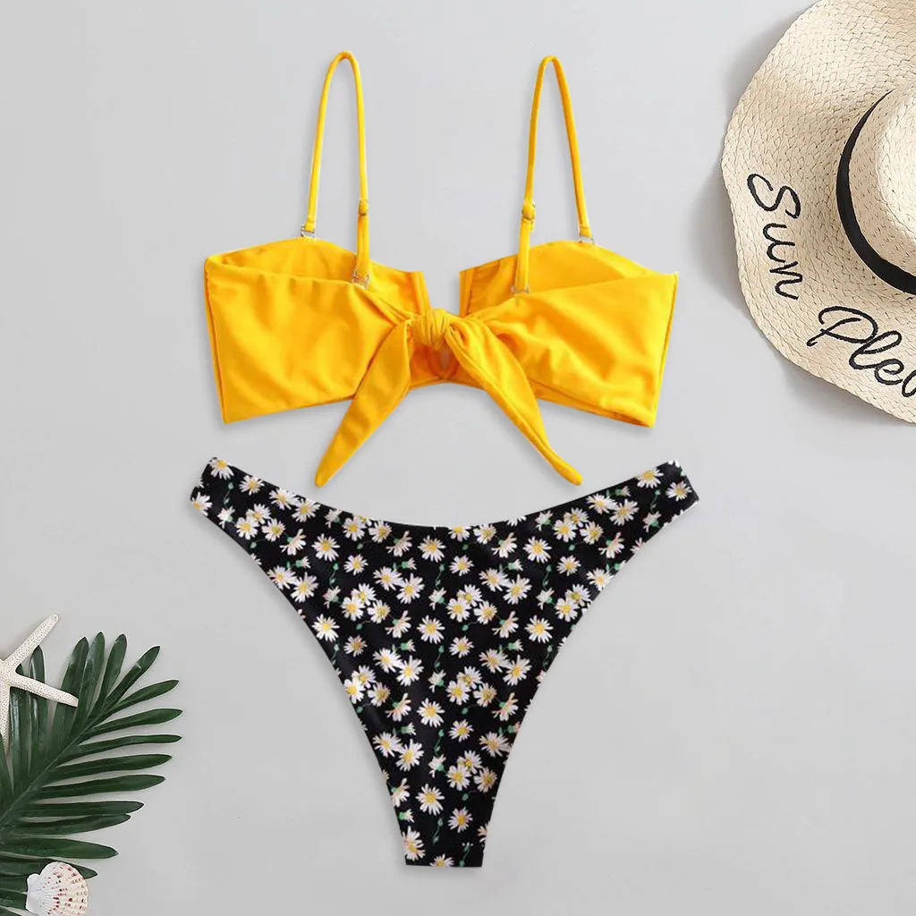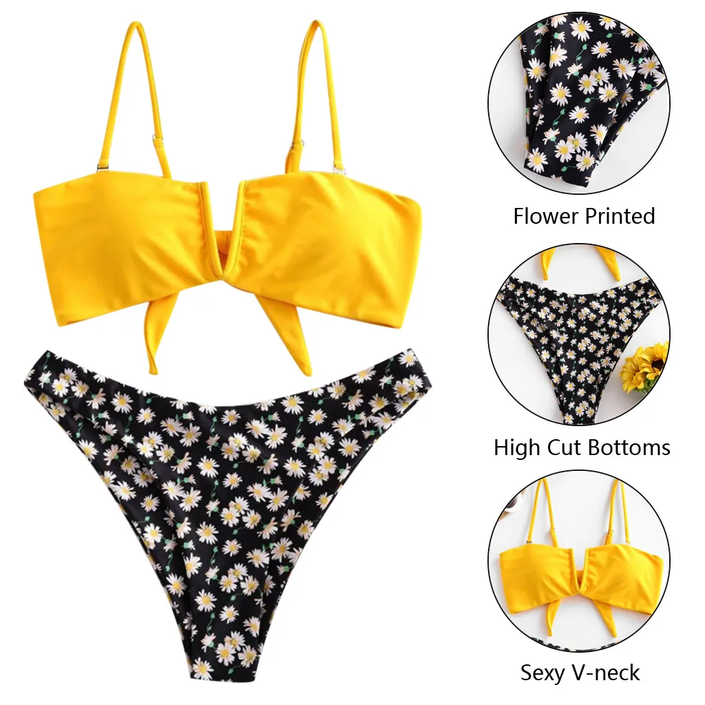 Купальный костюм женский, с цветочным принтом, с V-образным вырезом, из двух частей, бикини, купальники, пляжная одежда, купальный костюм для женщин, бразильский