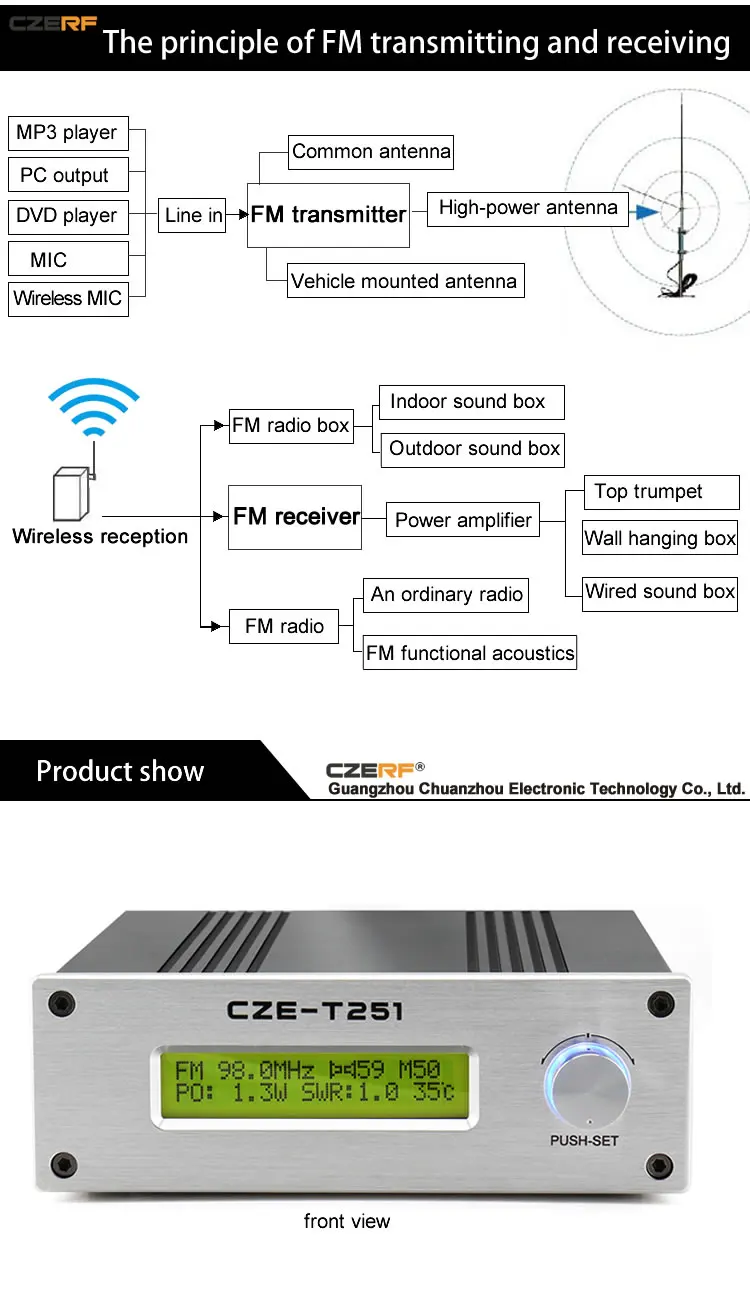 CZE-T251 25 Вт fm-передатчик. Проще в эксплуатации, управление одной кнопкой для всех функций. Он имеет защиту VSWR, температурную защиту, электронную регулировку громкости, оснащен фильтрами с низким проходом. Он применим во многих местах, таких как стадион, Уездная радиостанция, общественная радиостанция, мотель, общественная площадь, церковь, театр и так далее.