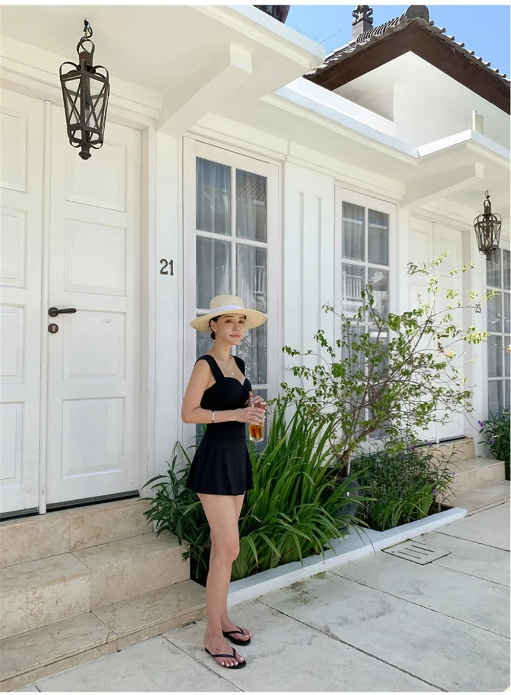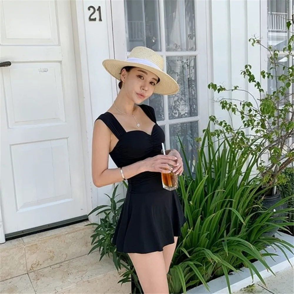 Корейский стиль, цельный купальный костюм, Женская однотонная купальная одежда, юбка, монокини, пуш-ап, купальный костюм, плиссированный трикини, подушечка бандо, купальный костюм