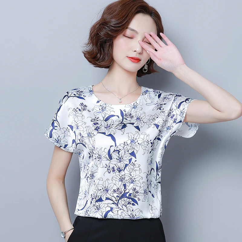Блузка женская шелковая с цветочным принтом, коротким рукавом и кру...