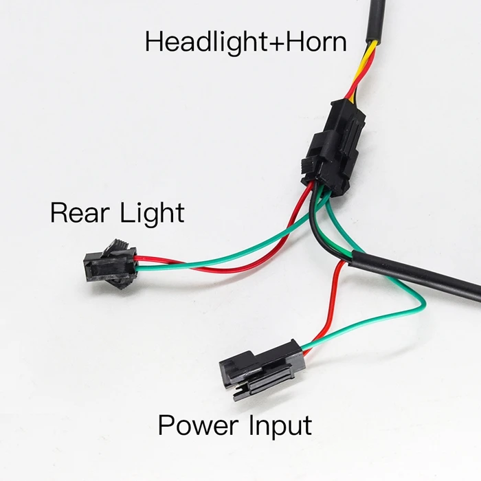 2. Переключатель поставляется с тремя разъемами, штекер-подключение к источнику питания (мотор или контроллер электровелосипеда), гнездовой-подключение к головному фонарю электровелосипеда, И еще один (2 контакта)-это подключение к задсветильник Рю электровелосипеда.
