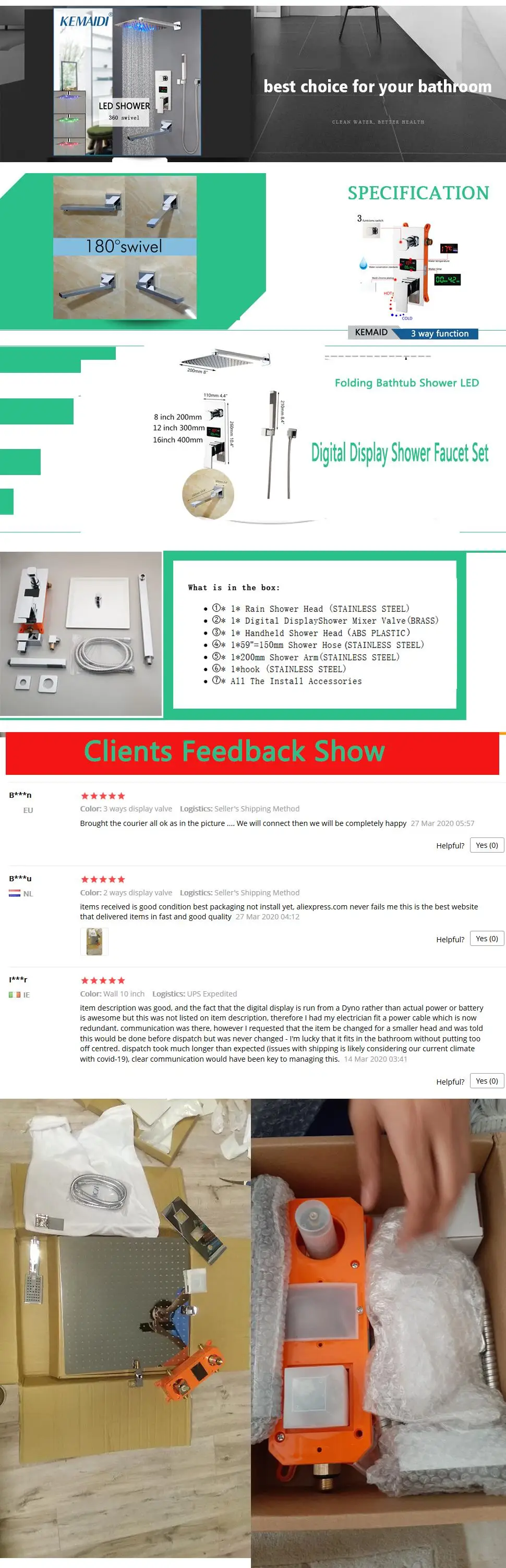(01)* Type: Chrome LED Digital Display Shower Faucet Set(02)* KEMAIDI Brand Unique(03)* Shower Head Spout material:silicone (04)* Shower Head Material: stainless Steel (05)* Mixer control Valve Material: brass (06)* Handheld Shower Head Material: abs plastic (07)* Finish Style: chrome(8)* Shower Head Size: 8,10,12,16 inch(9)* Shower Arm Size: wall mounted 400mm / ceiling mounted 200mm(10)* Install Method:wall mounted / ceiling mounted(11)* Mixer Control Valve Type: hot and cold(12)* Connection Parts Size: ½” NPT connectors(13)* Drip Free Ceramic Disc Cartridge For Smooth And Long Lasting Operation(14)* Brand New In Box Ready To Ship: (15)* Easy To Clean. Can Be Cleaned With Mild Soap To Ensure The Non-tarnish Life Shine(16)* I Describe Items As Well As I Can. If I Have Missed Something, Please Let Me Know.(17)* Comes With 2 Year Manufacture Warranty