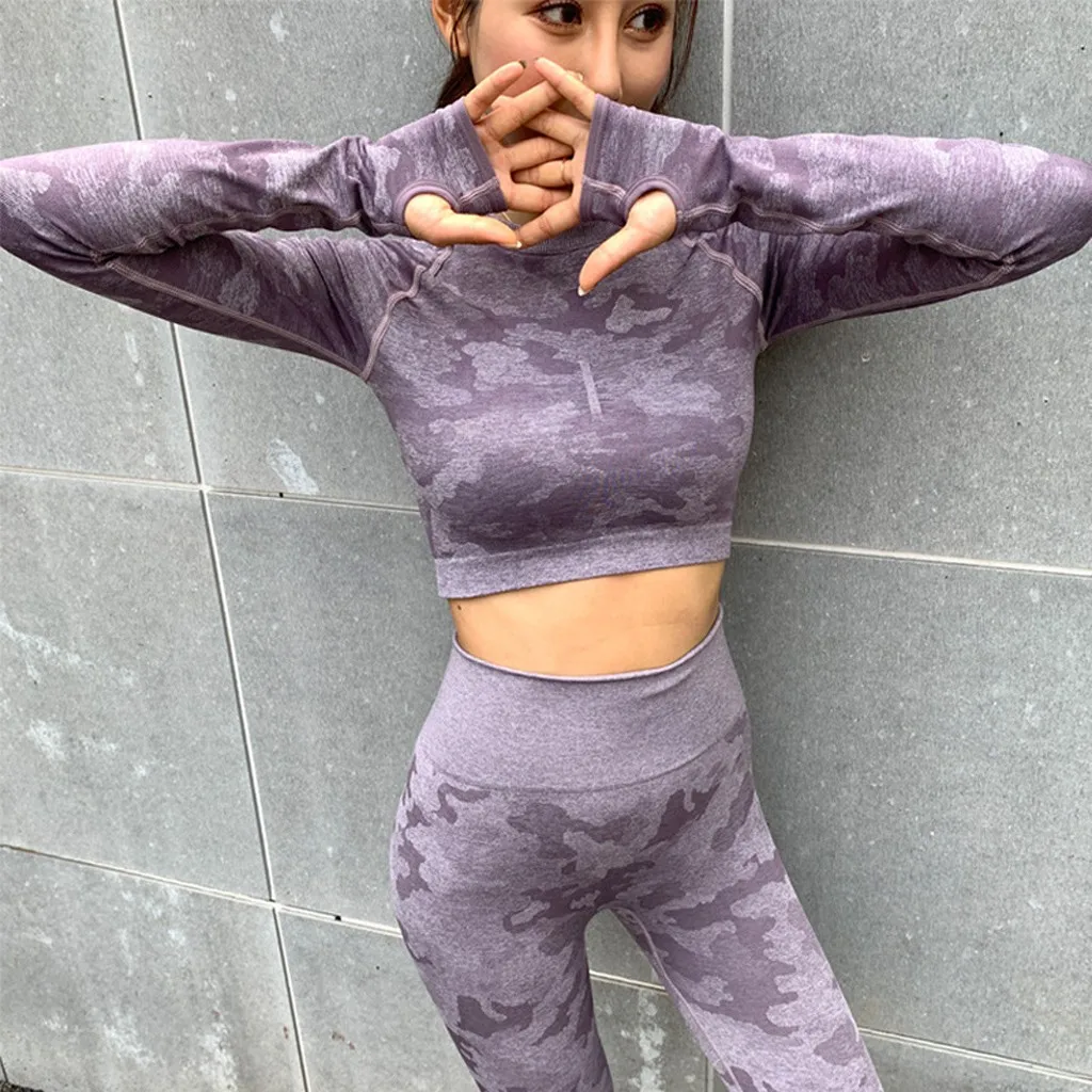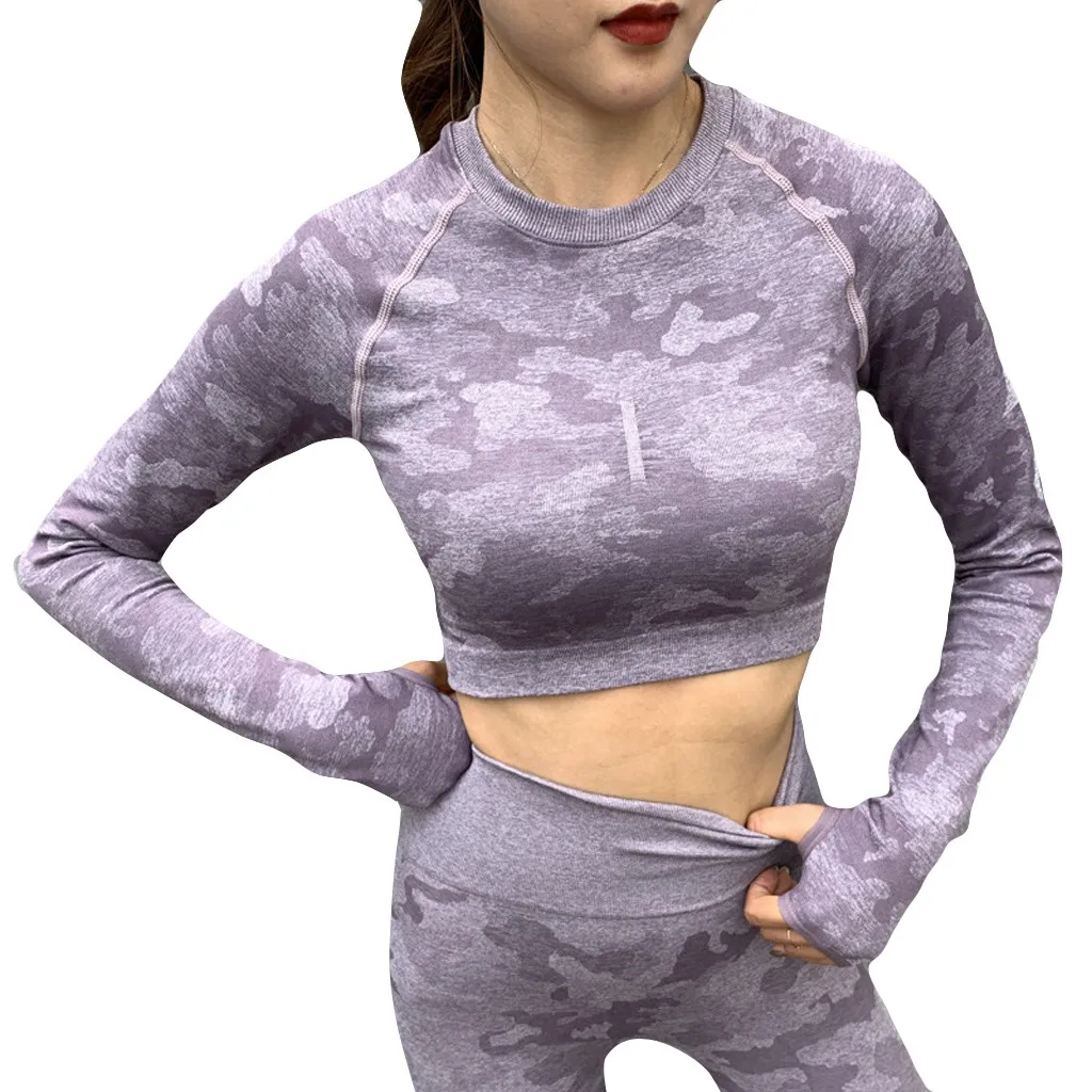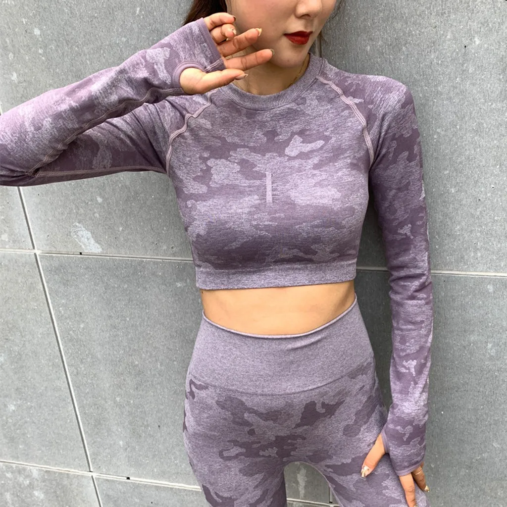 Женские комплекты для йоги, 1 шт., бесшовная камуфляжная одежда с коротким рукавом для спортзала, леггинсы для фитнеса + укороченные рубашки, спортивный костюм