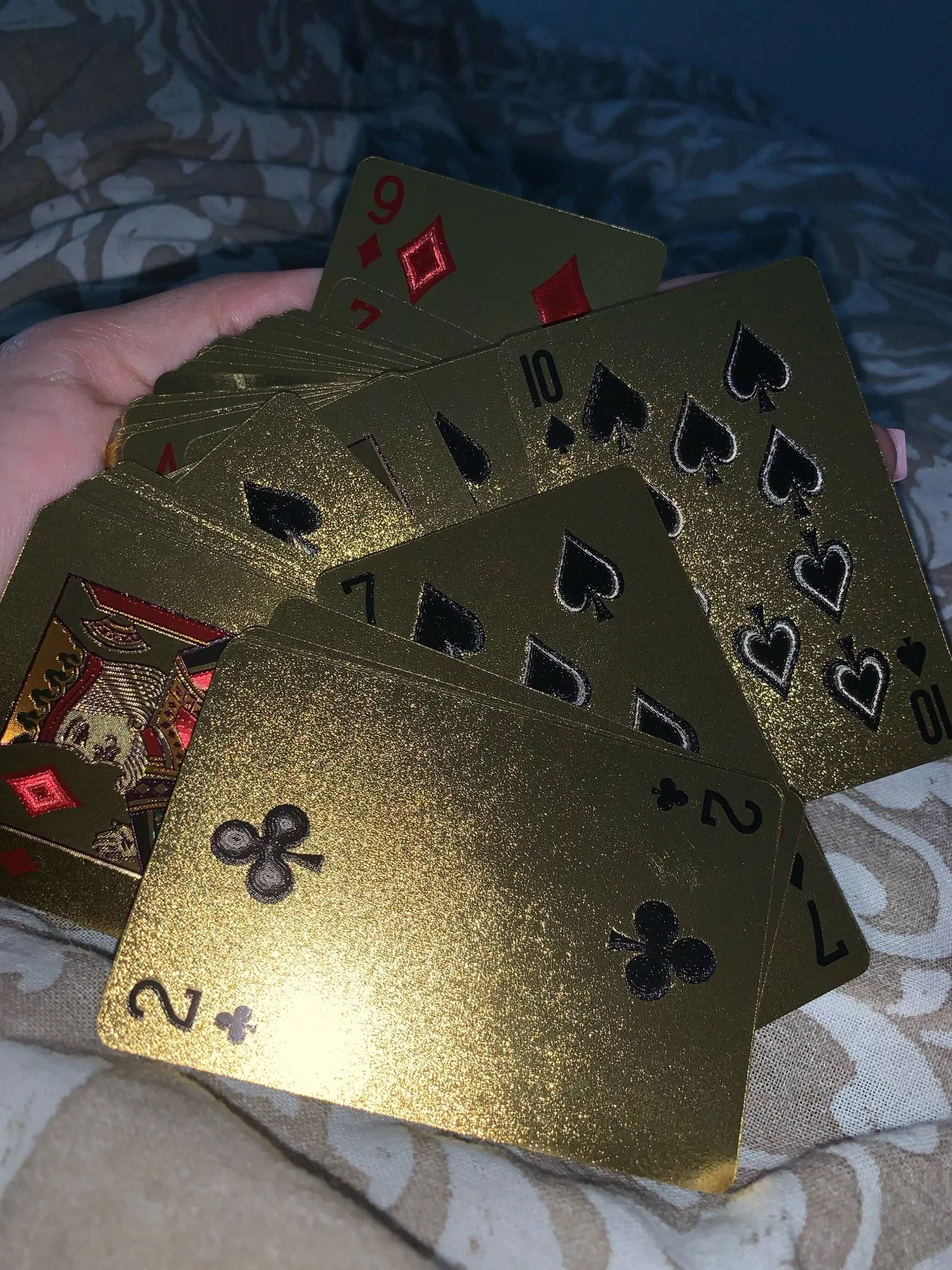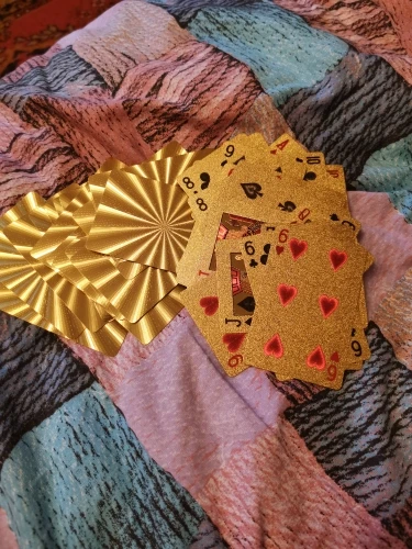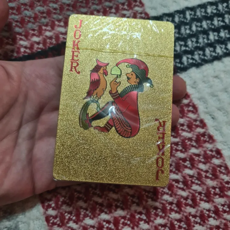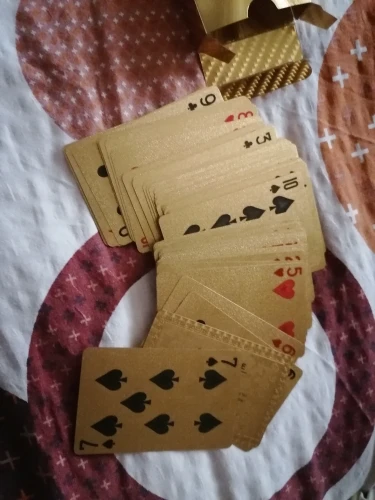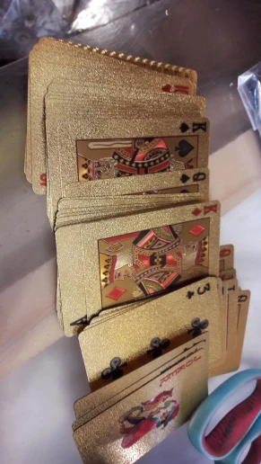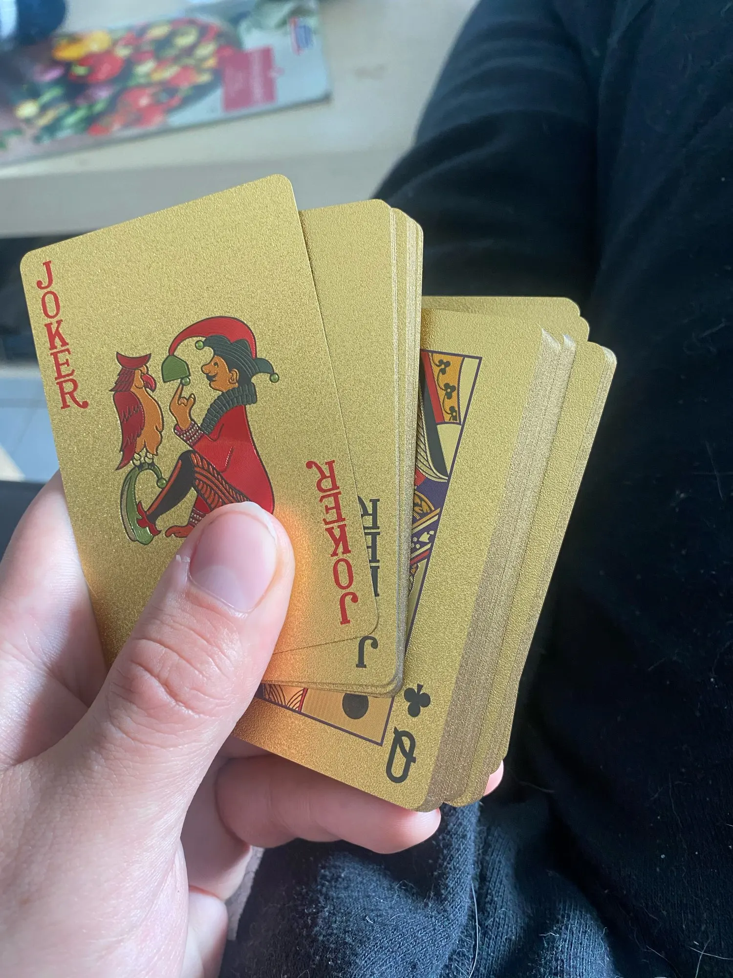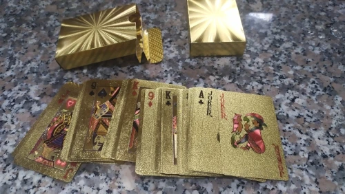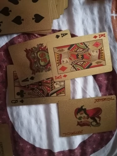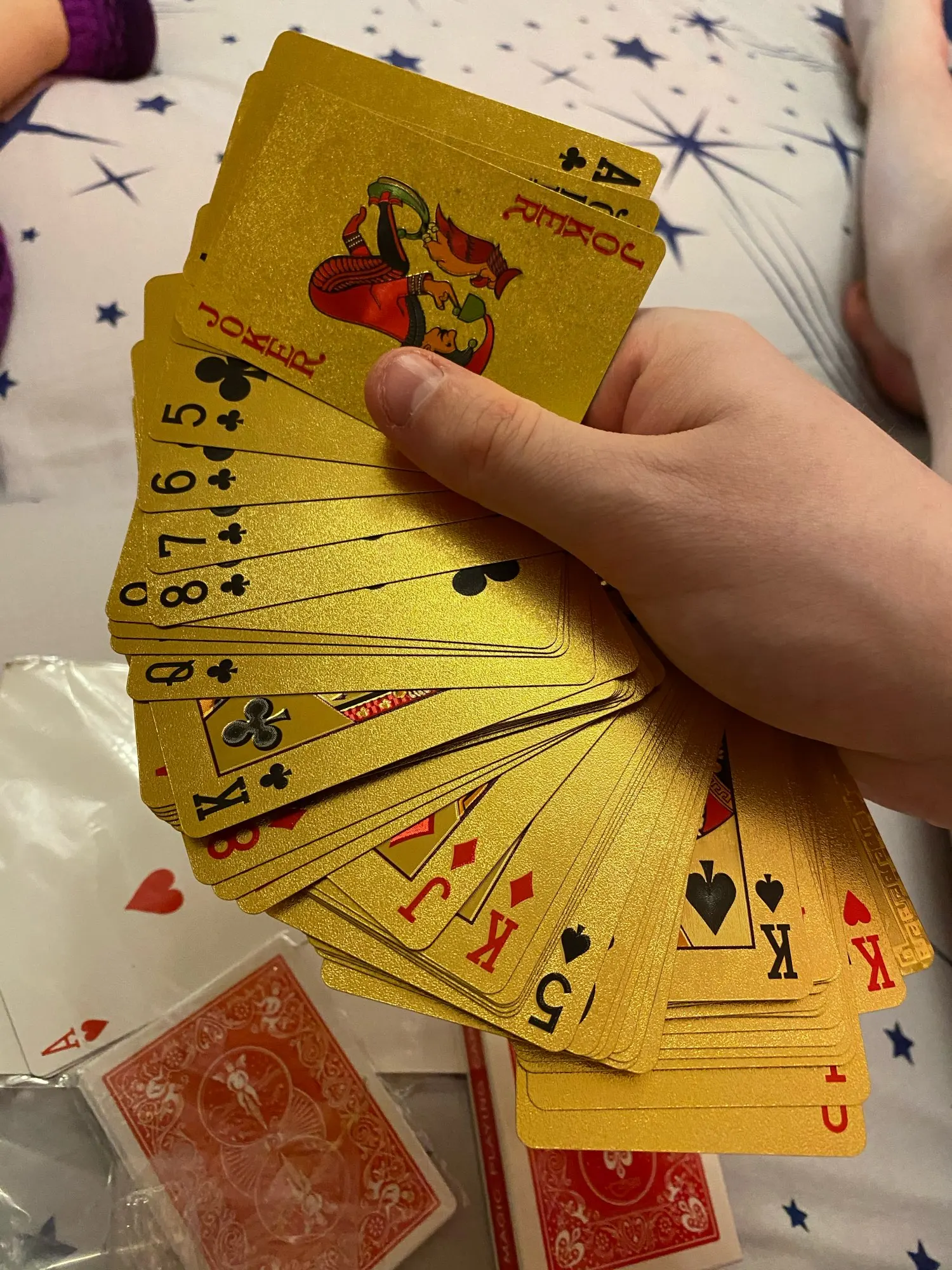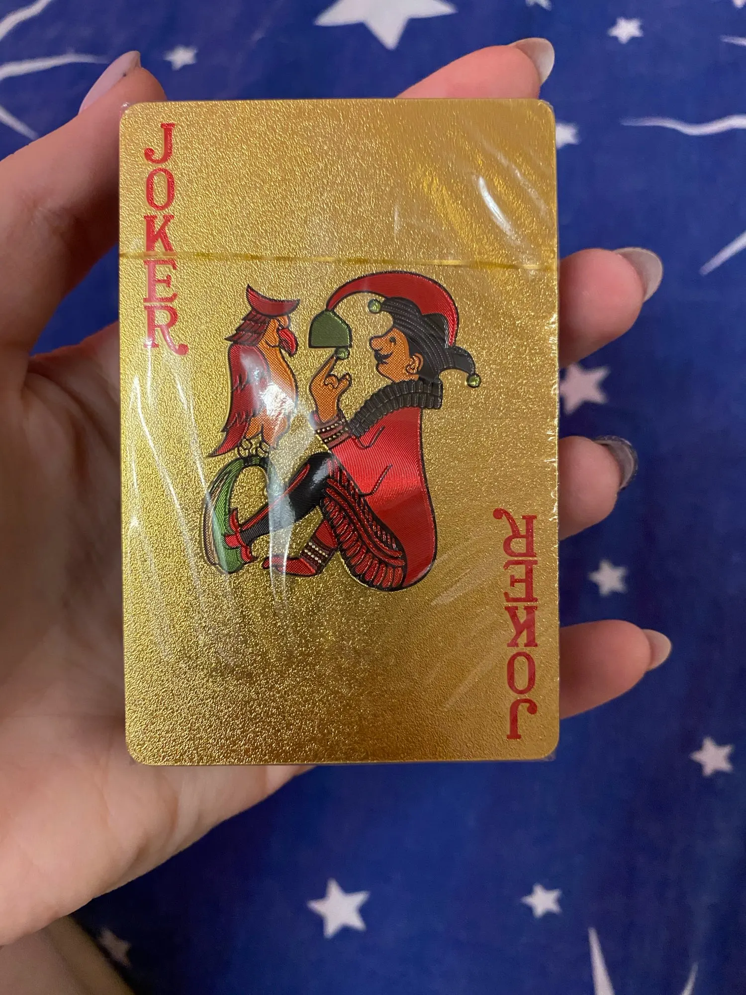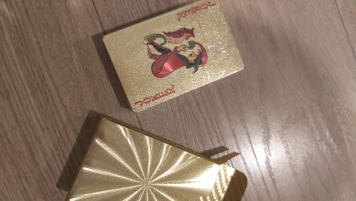 клёвые карты, качество хорошее! всё из пластика(упаковка в том числе). огонь, и пришли быстро. ооочень крутой товар в ооочень приятную цену, ну 92 рубля за упаковку охрененных золотых пластиковых 54х карт прям ни о чем цена. и упакованы были хорошо. блин я прям очень довольна покупкой