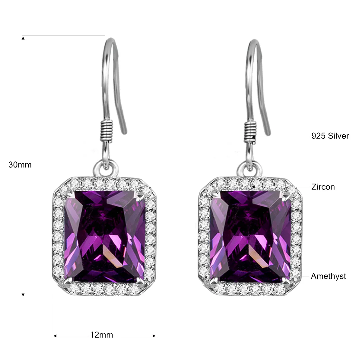 Бренд: SzjinaoТип камня: аметистРазмер основного камня: прибл. (12*30 мм)Четкость камня: VVSЦвет камня: ПрозрачныйФорма камня: квадратнаяТип металла: 925 пробы-серебро + покрытие из белого золотаБоковой камень: AAA + кубический циркон