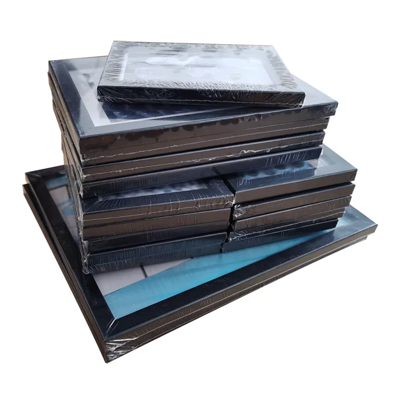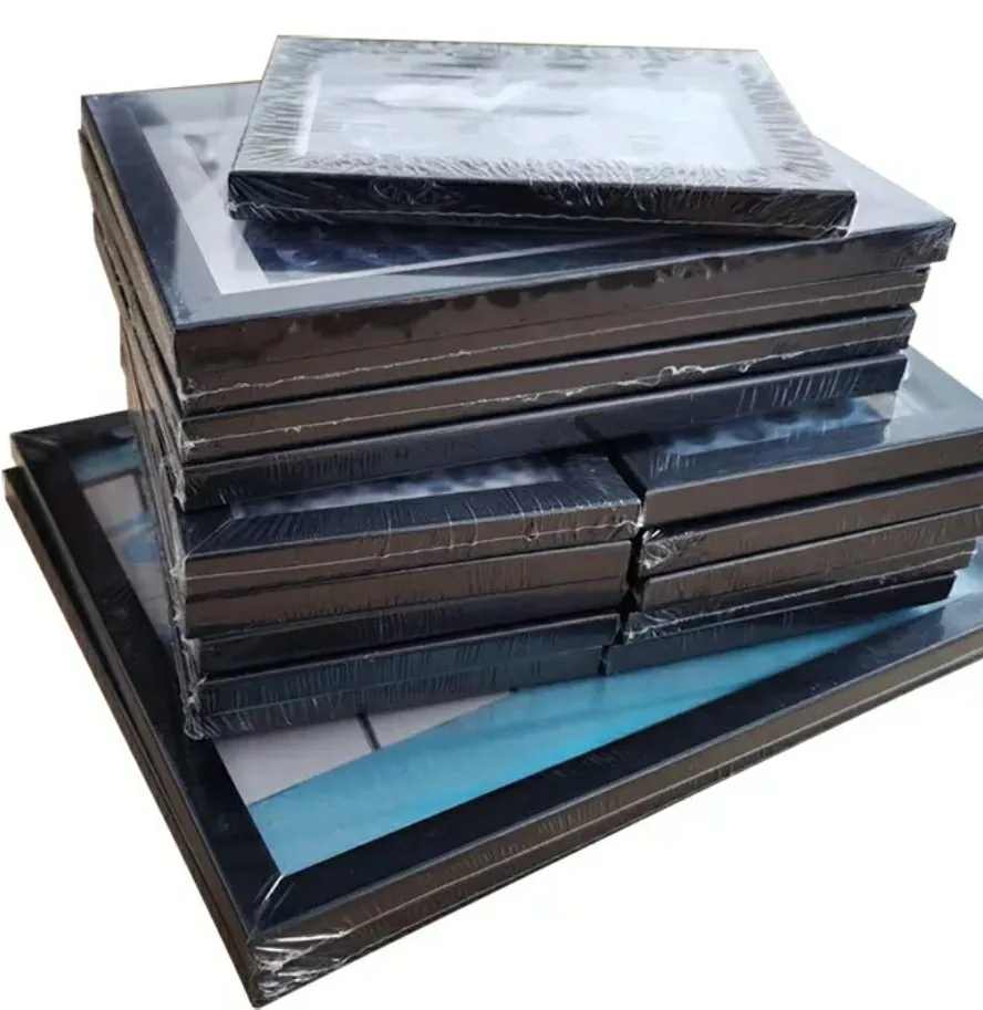 рамки из дерева, вместо стекла пленка в защитной пленке пленке. дошло до спб за 3 недели. размеры не стандартные, ну и разные, всмысле не все 9х13 отклонения 0,5 мм. в целом нормально