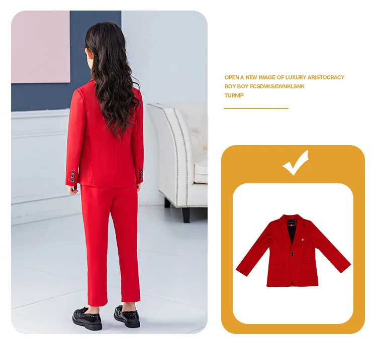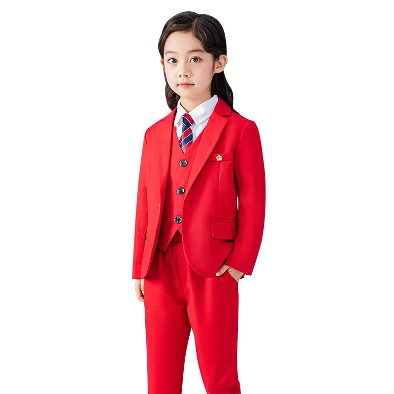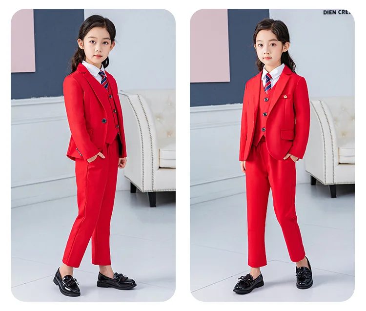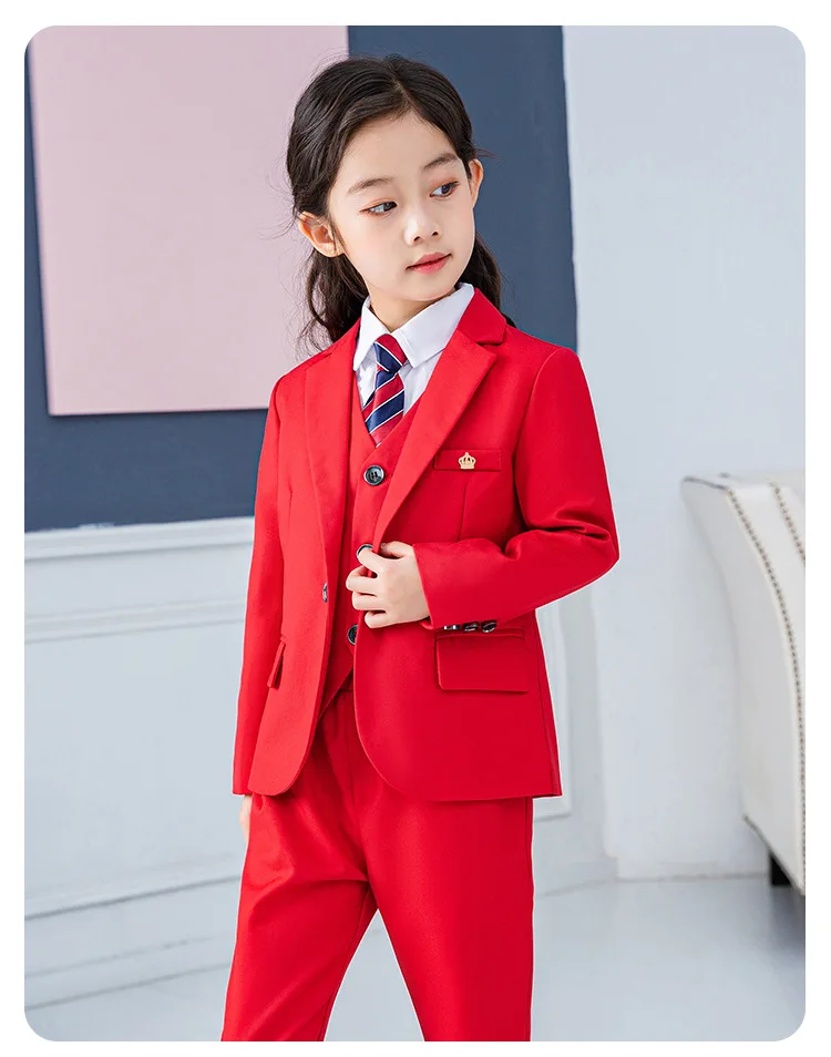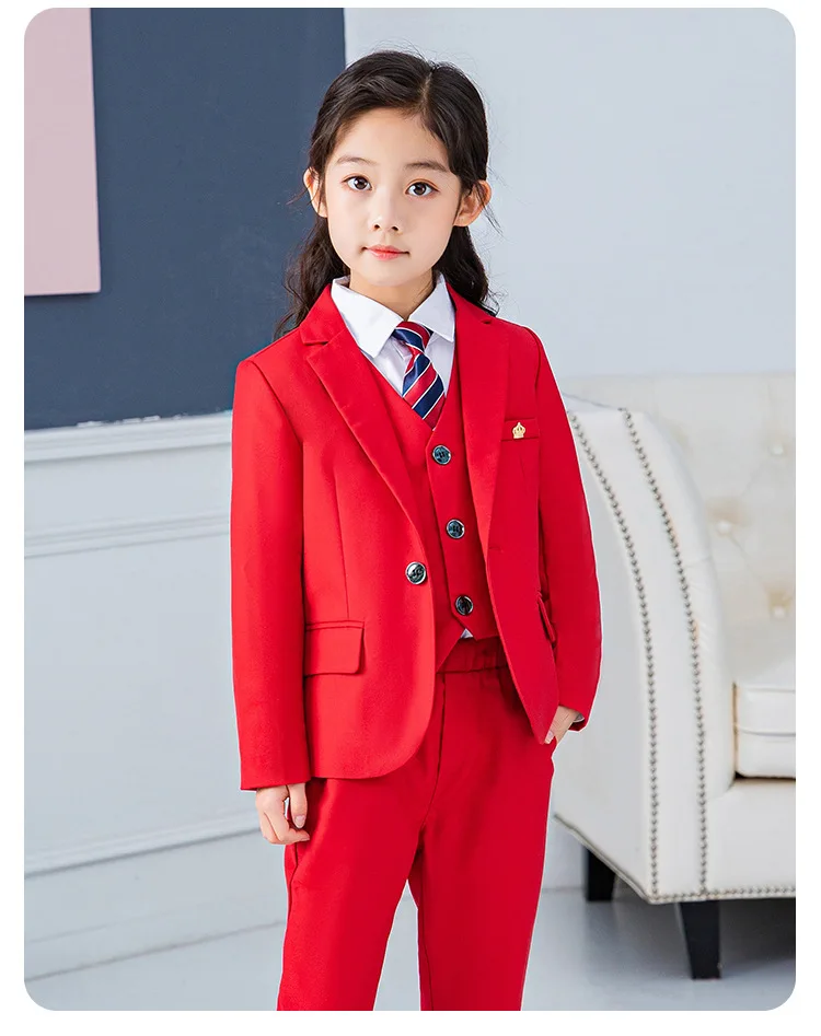 Красный строгий костюм для девочек, Детский костюм принцессы на свадьбу детский Блейзер, жилет, рубашка, штаны, комплекты одежды с галстуком