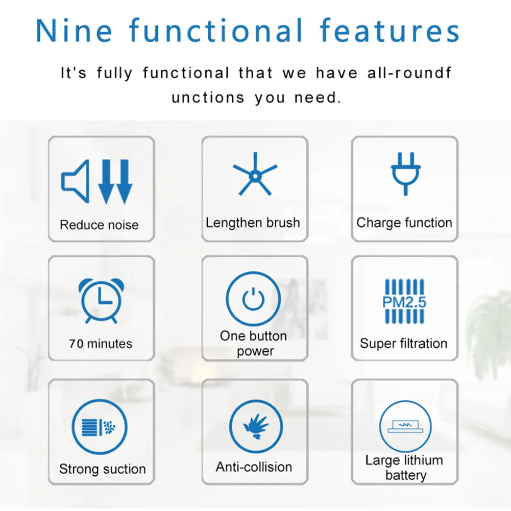 Функции: запуск одной кнопкой, подметание, уборка, пылесос, зарядка через USB, универсальное вождение, автоматическое Предотвращение препятствий, защита от падения, низкий уровень шума, сильное всасывание, низкое повторение, высокий охват