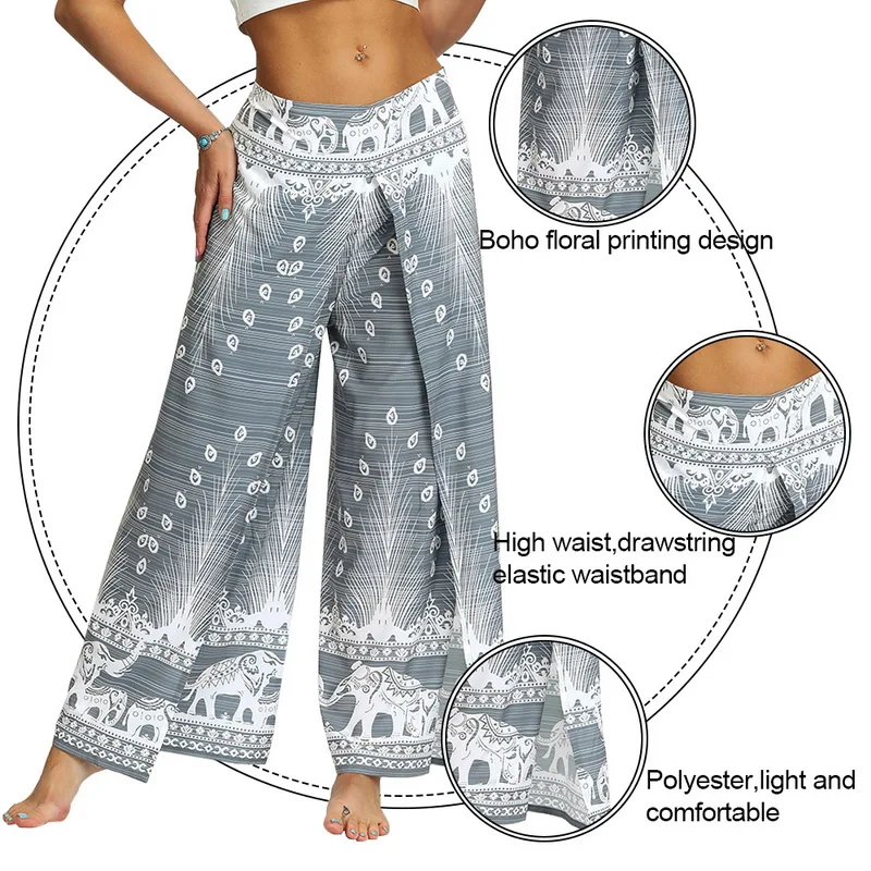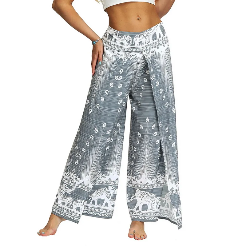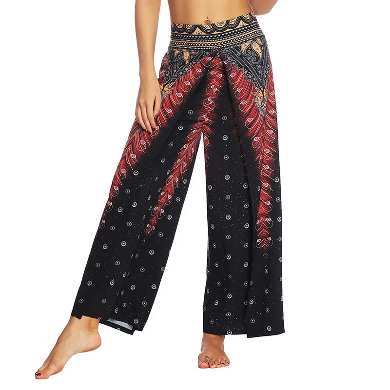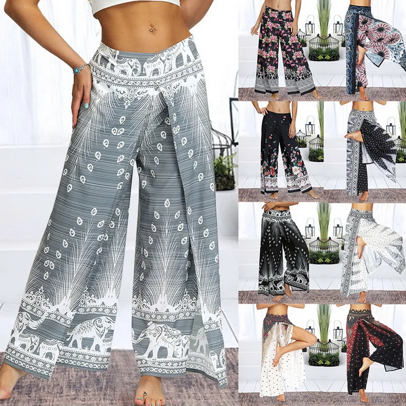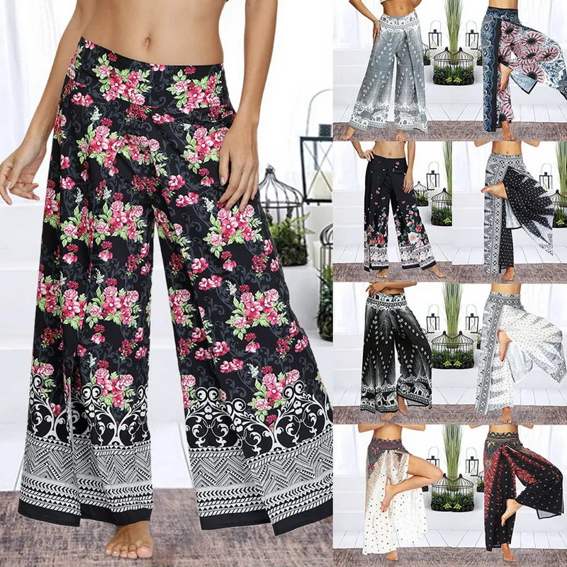 Женские брюки палаццо с широкими штанинами, летние повседневные пляжные штаны с принтом в стиле бохо, штаны размера плюс с высокой талией для занятий йогой, спортивные штаны 2020