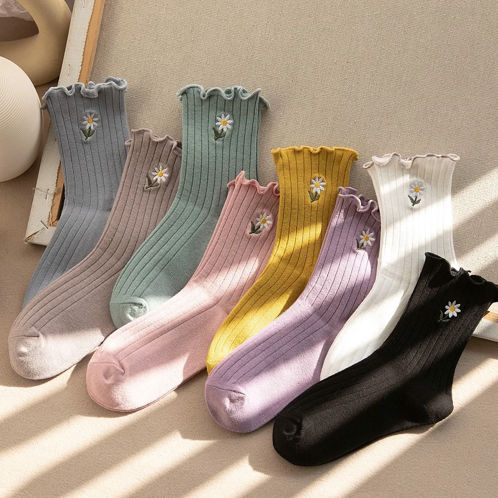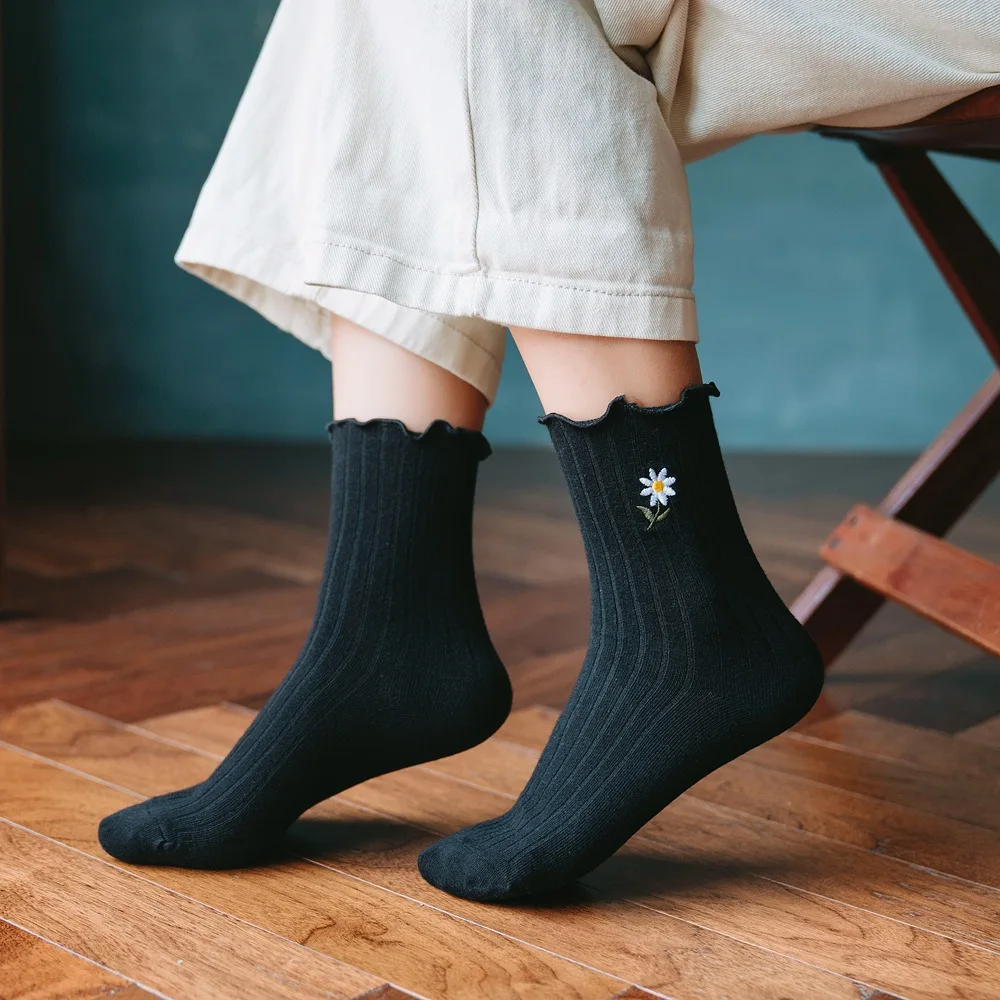 Японские Женские носки с цветочной вышивкой, носки с вертикальными полосками