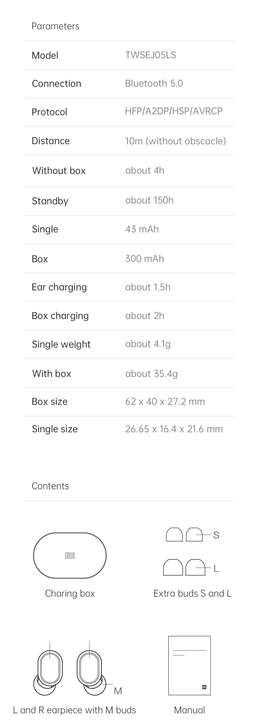 Зарядная коробка * 1 + наушник * 2 пары + наушники + руководство пользователя, нет микро-usb кабеля