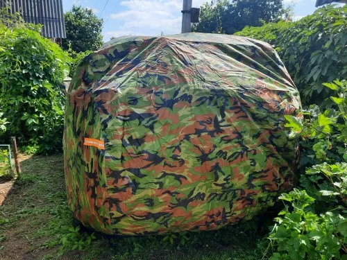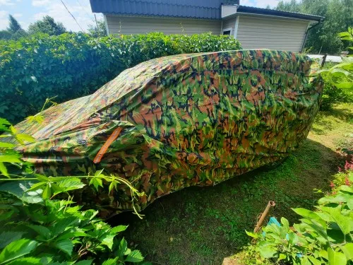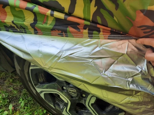 Хороший чехол. по размеру подошёл идеально, снизу есть ремни с замками, можно очень прочно зафиксировать. Резинки под бамперами хорошо держат, карманы даже есть. Снизу чехол фольгированный какой-то. Лёгкий, тонкий, вроде прочный. Идёт в комплекте с мешком для хранения.