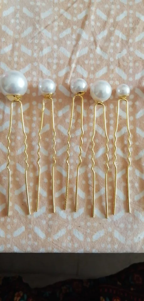 шпильки очень красивые, НО: сама не уследила, что концы шпилек НЕ закруглённые! из-за этого вводить их в волосы больно, волос они тянут. Обратите на это внимание при покупке! При первом же использовании одна бусина отломилась от шпильки (см. фото)