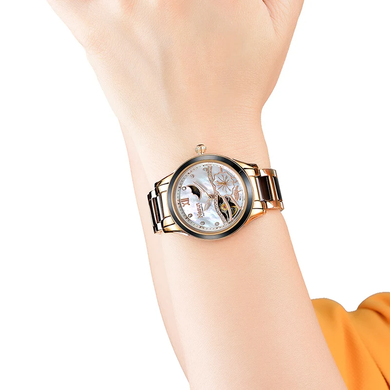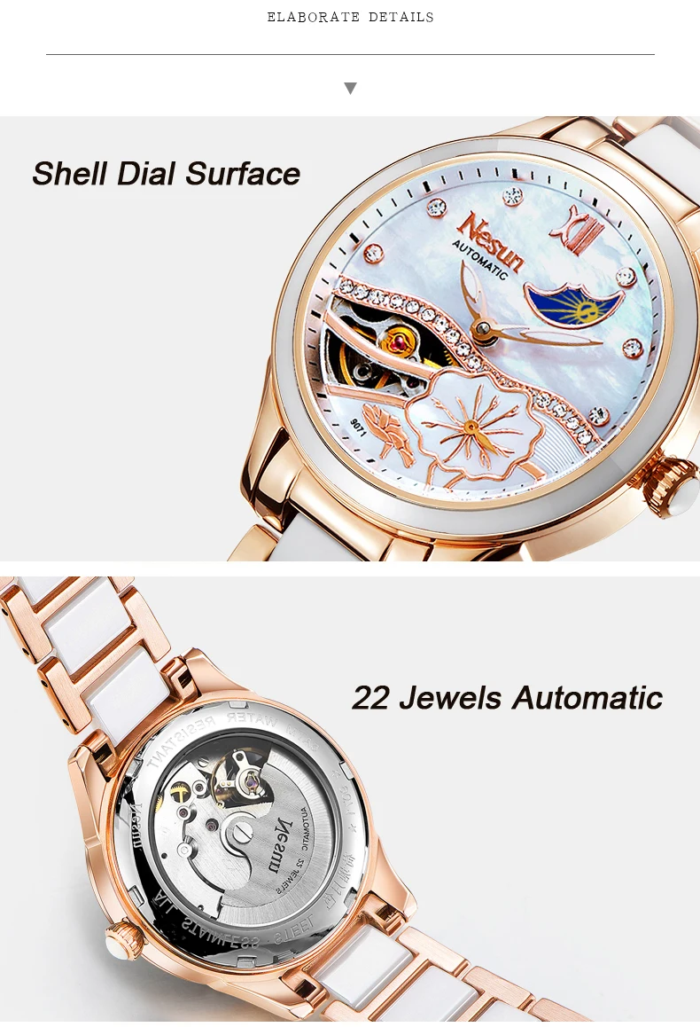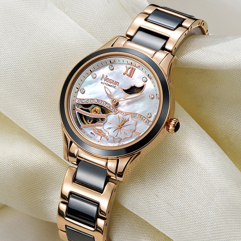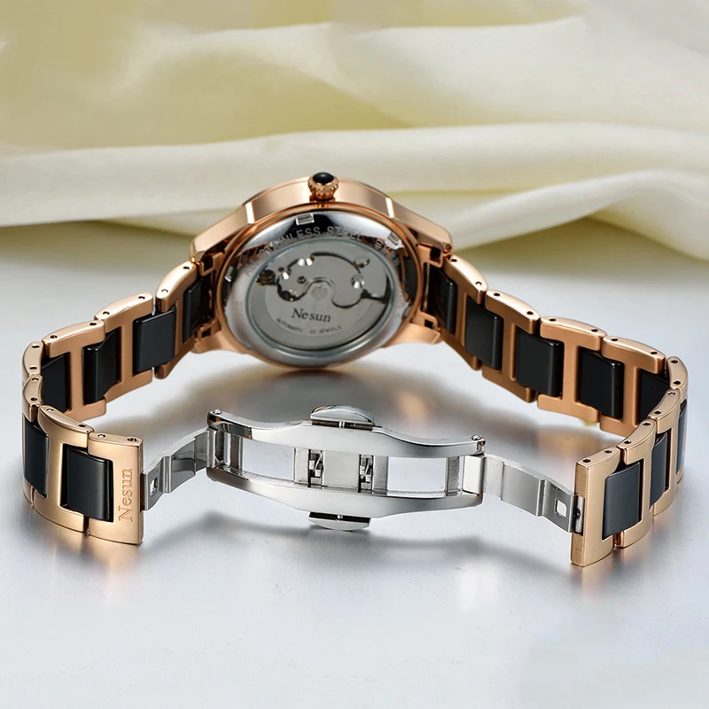Новинка, часы NESUN, женские деловые механические часы-скелетоны с автоматической обмоткой, уличные водонепроницаемые женские керамические наручные часы