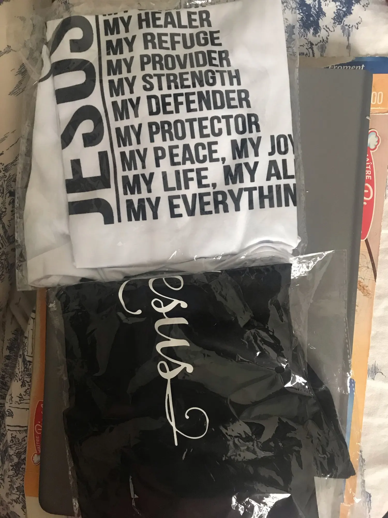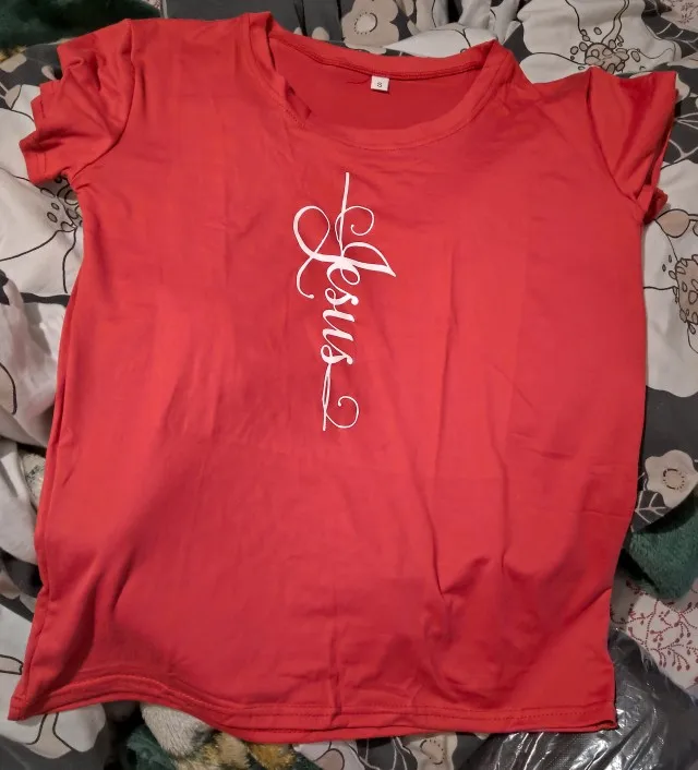 Футболка женская с изображением имени Иисуса и названий выше, винта...