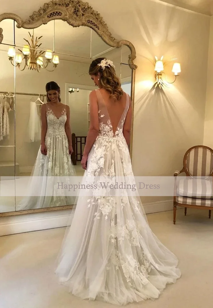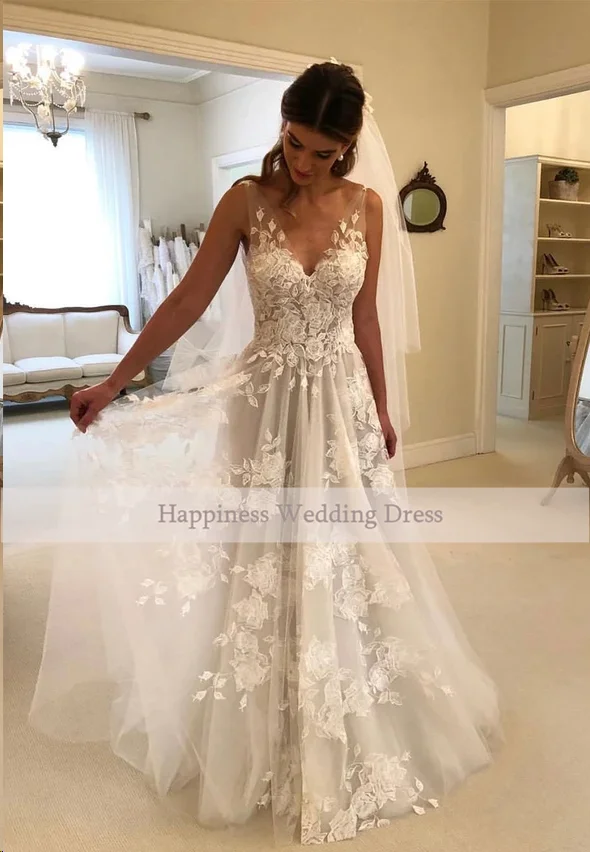 Кружевные свадебные платья с V-образным вырезом, трапециевидная апп...