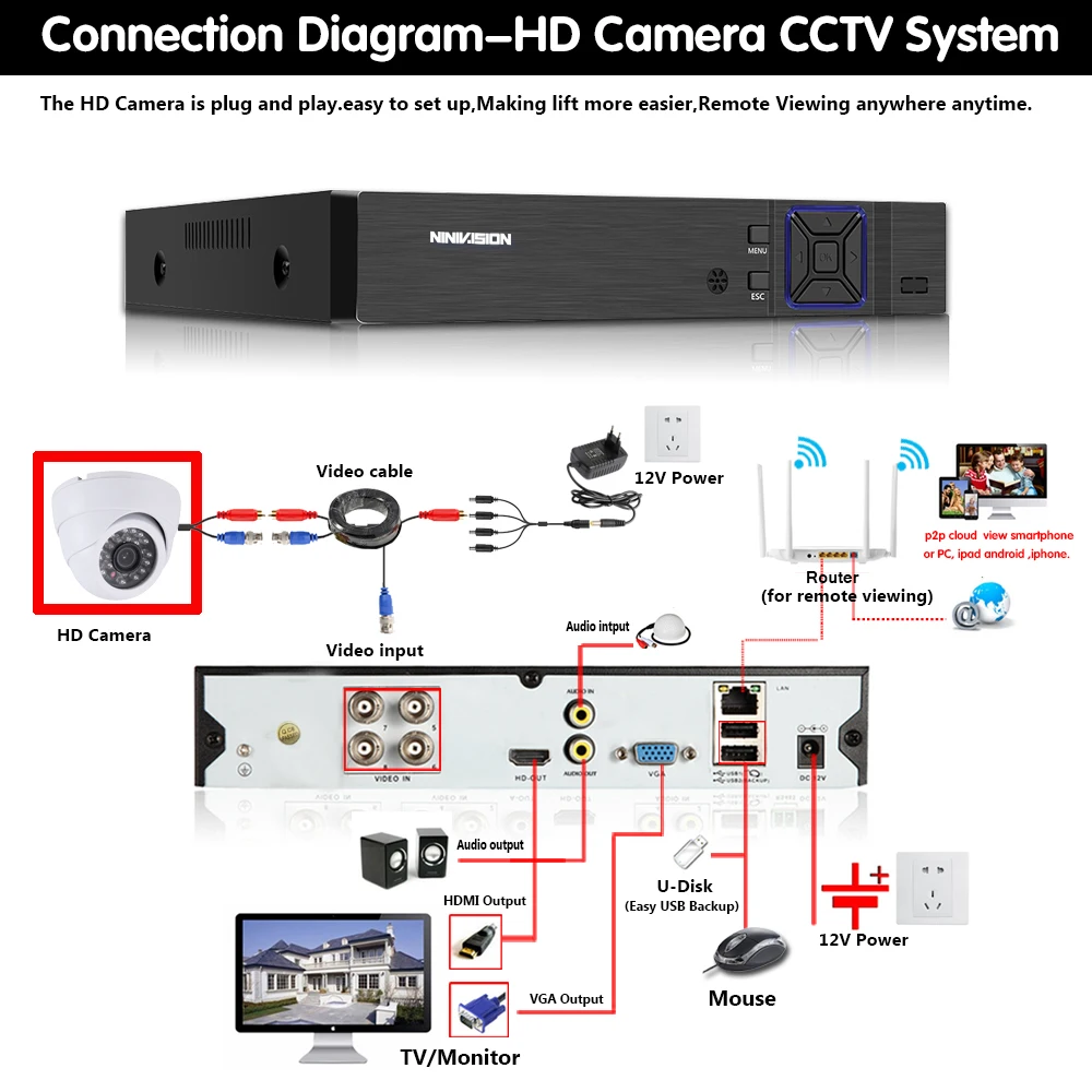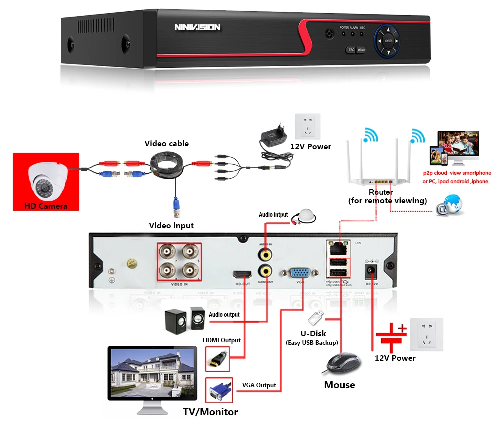 Простая настройка, всего 4 шага для просмотра на мобильный телефон,Просмотр видео в режиме реального времени в системе из любого места и в любое время с помощью смартфона, стола или ПК с передовой технологией P2P, вы можете получить удаленный доступ к вашей системе в течение нескольких минут или меньше, нет необходимости в переадресации, удаленный доступ никогда не был таким простым!