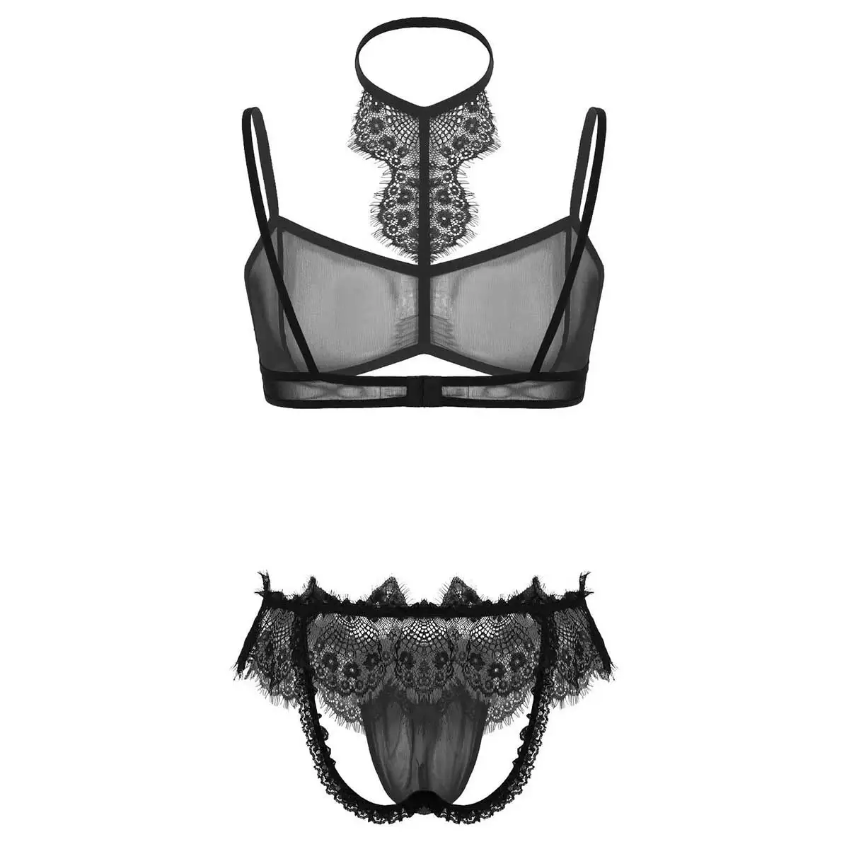 Сексуальное мужское нижнее белье, кружевная отделка, Прозрачный Женский комплект, бюстгальтер с лямкой на шее, топ с открытыми ягодицами, трусы-джоки, нижнее белье