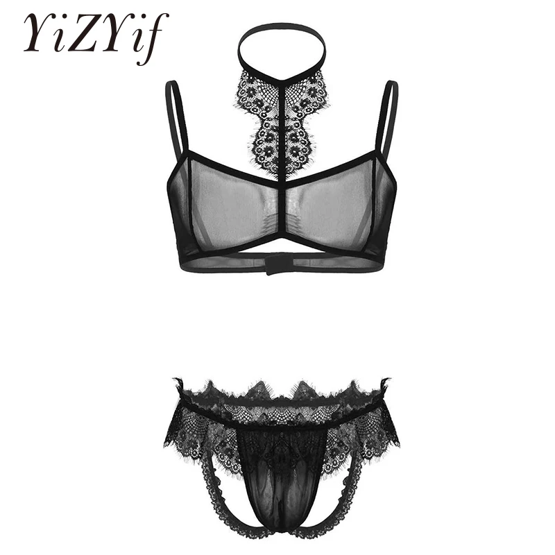 M-XXL, 2 предмета, Мужской Прозрачный сетчатый кружевной комплект нижнего белья, сексуальный бюстгальтер с лямкой на шее, топ с открытой спиной, бандаж, трусы, нижнее белье, одежда для сна