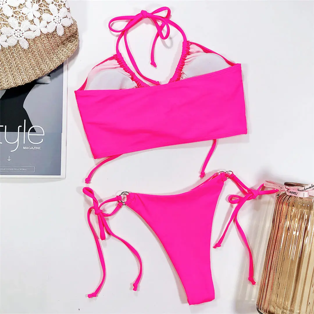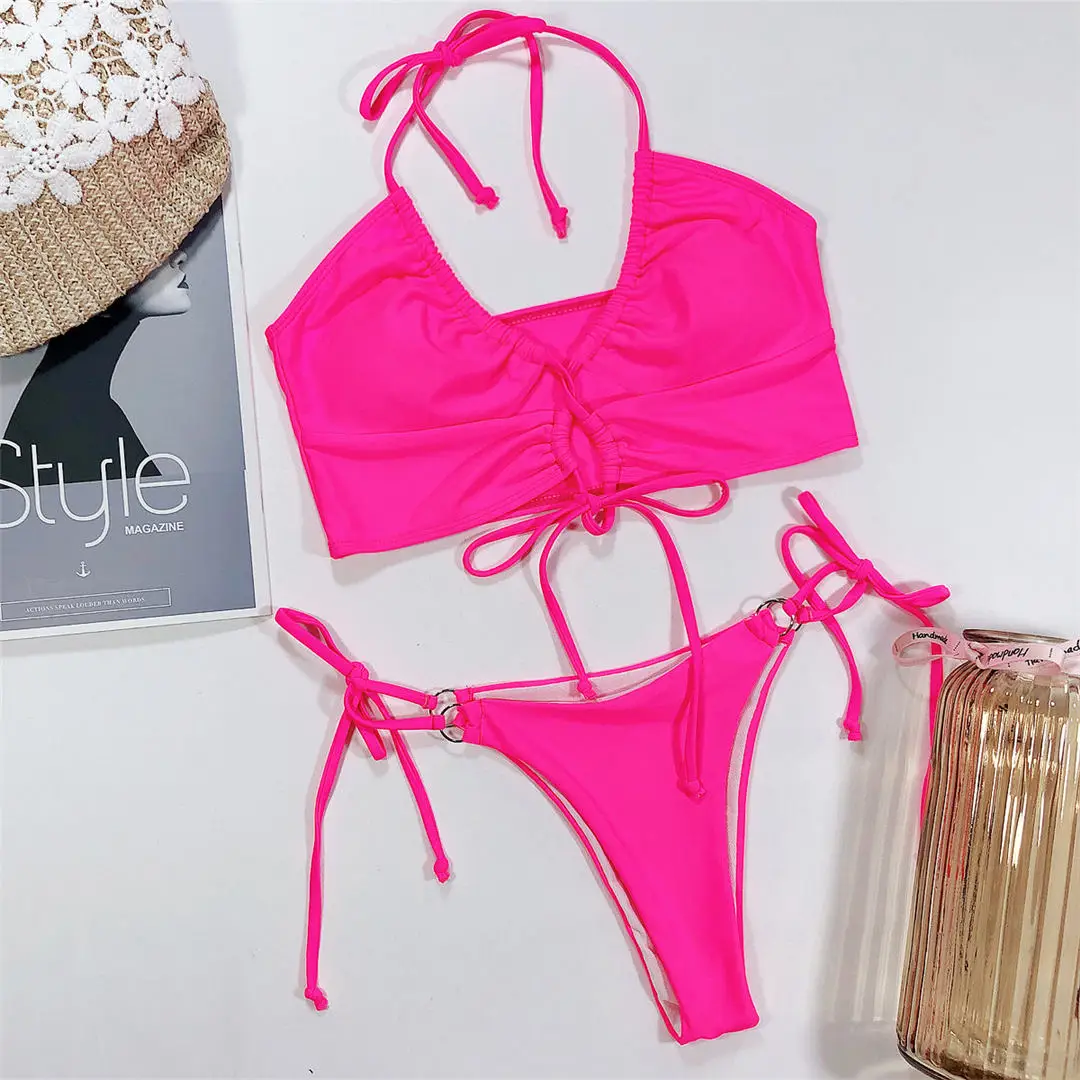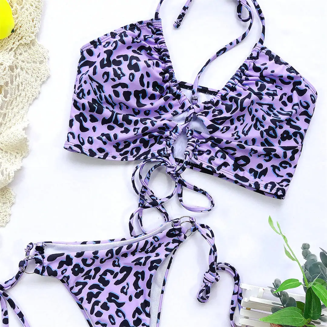 S-XL, сексуальное леопардовое бикини с лямкой на шее, Женская купальная одежда, женский купальный костюм, комплект бикини из двух предметов, купальный костюм на шнуровке V1708P