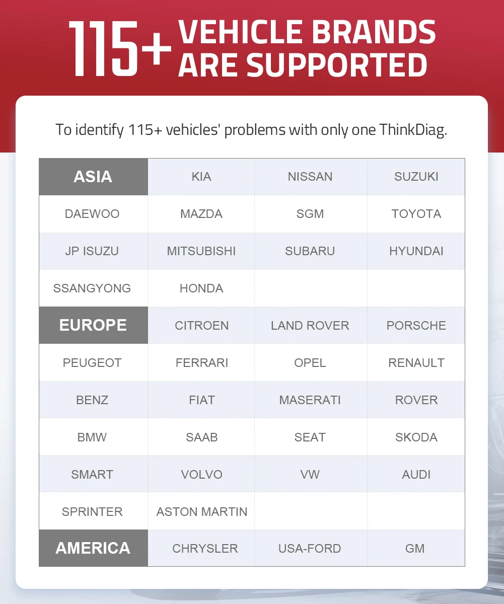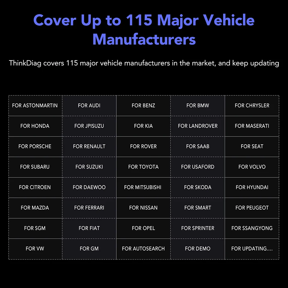 ThinkDiag охватывает 30 крупнейших производителей автомобилей на рынке и продолжает обновляться до 115 производителей автомобилей