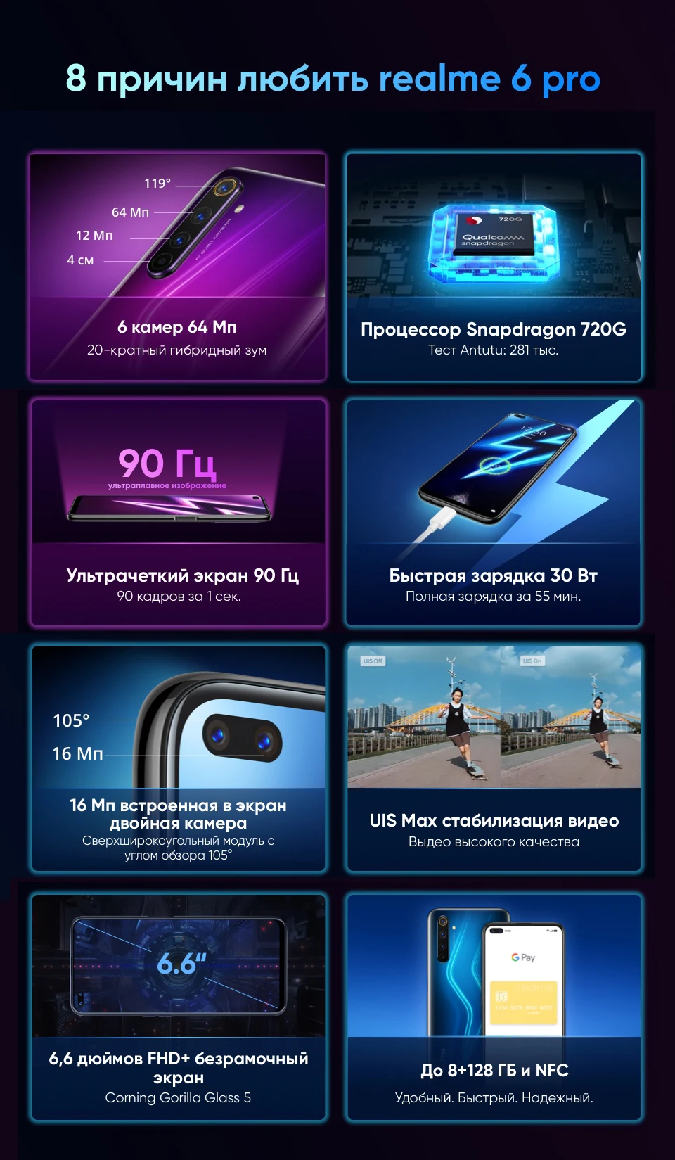 Смартфон Realme 6 Pro 8+128 ГБ, 6 камер 64 Мп,Snapdragon 720G,Быстрая зарядка 30 Вт,Экран 90 Гц, NFC, российская гарантия Molnia
