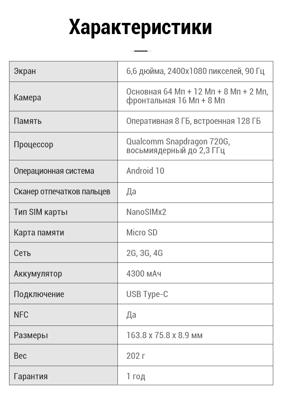 Смартфоном муж доволен, ранее заказывала себе такой же, только в другом цвете-красная молния, прибыл в Бурятию за 6 дней. Фото получаются отличного качества -камера 64 мегапикселя, 20 кратный зум, видео тоже порадовало- звук чёткий. Имеется две фронтальные камеры. Батарея 4300 ампер- держится долго, зарядное устройство 30 ватт, заряжает менее часа. Экран 6,6 дюймов- удобно лежит в руке. Данный телефон своих денег стоит, советую к покупке- берите не пожалеете!