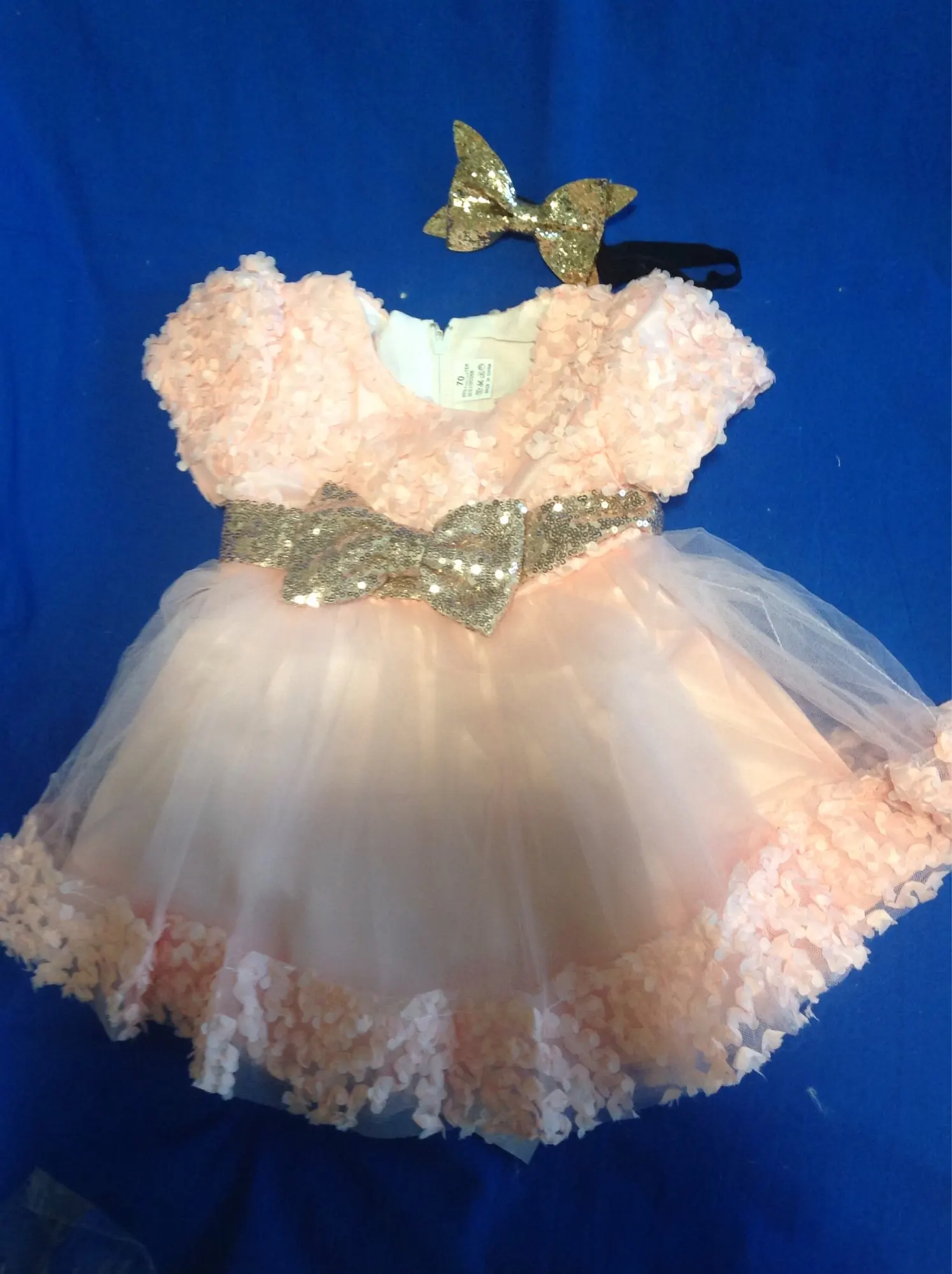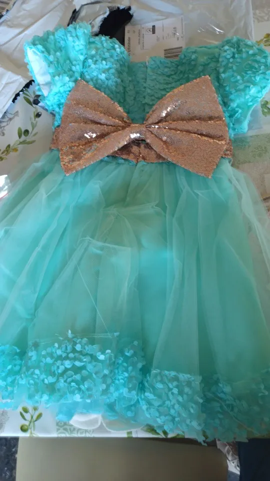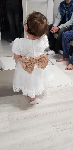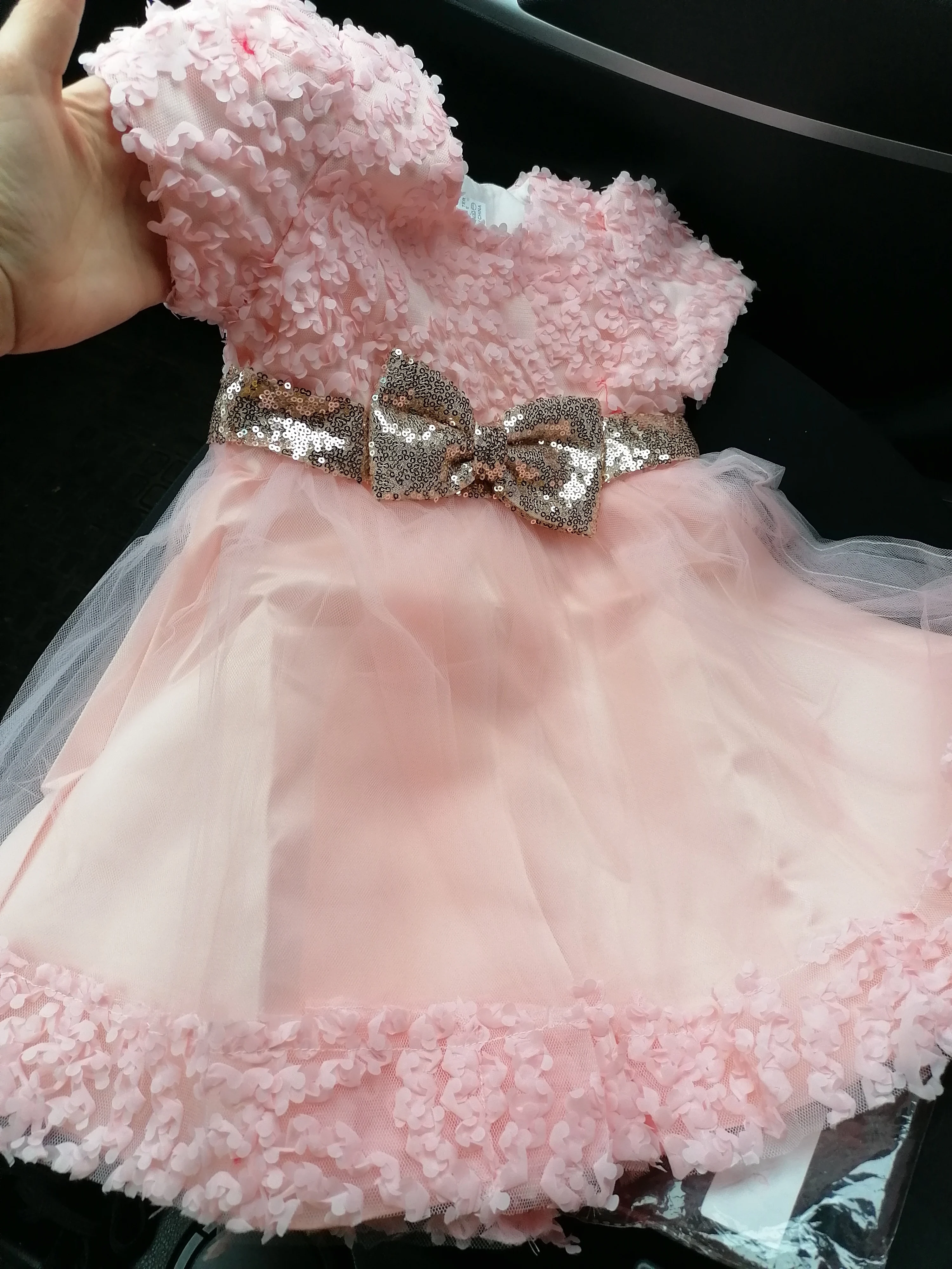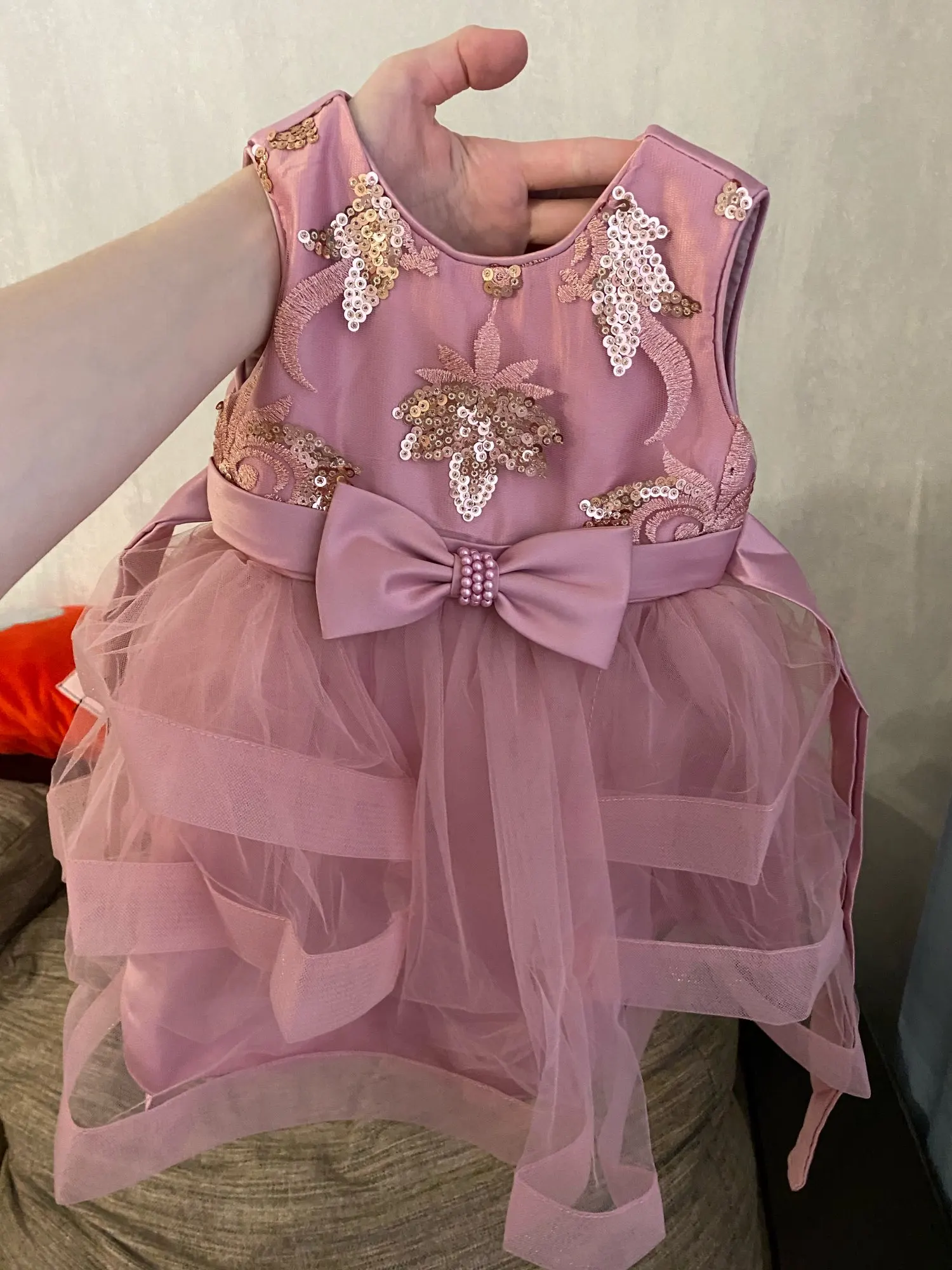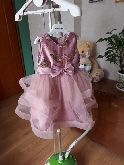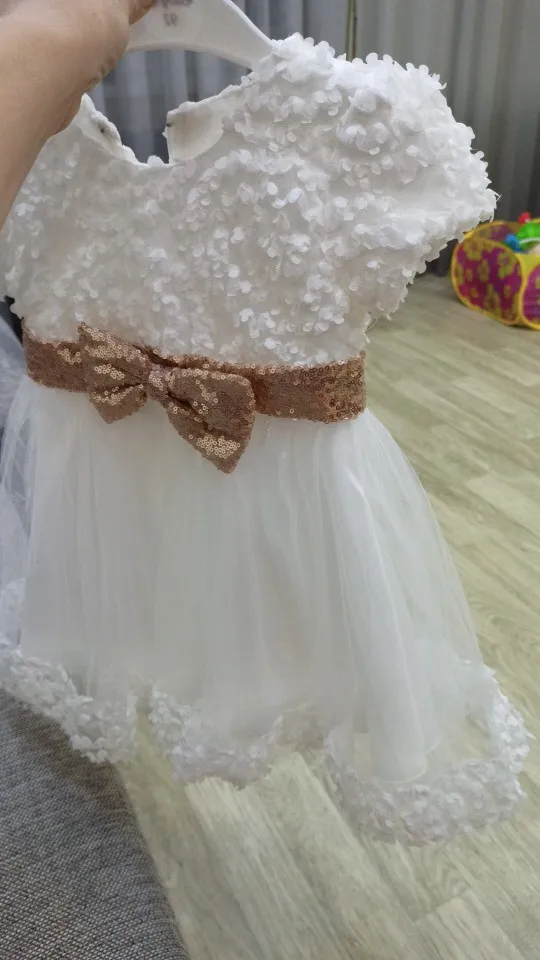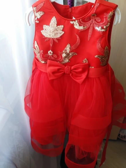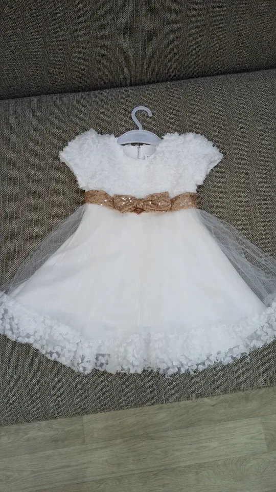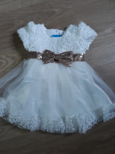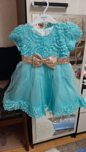 Платье понравилось, очень красивое. Все ровно и аккуратно сделано. Паетки все на месте, бант сзади отстёгивается. Нам сейчас 10 месяцев и размер немного велик, но я брала заранее на праздник на годик, поэтому думаю будет нормально , главное что не маленькое. Обхват талии 54 см , длина платья 49 см. Единственное что я не поняла, так это то , что резинка с бантиком на голову почему-то черная. Но не страшно , заменить легко. Доставка чуть больше 2-х недель. В общем - рекомендую однозначно