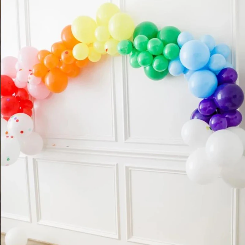Воздушные шары-гирлянды в комплекте: 42 шт х 5 дюймовые шары (каждого цвета по 6 шт, кроме белых) 36 шаров X 10 дюймов (8 белых, остальные 4 шт.) 1 шт х 5 м воздушная цепь Цвета в комплекте: белый, красный, розовый, оранжевый, желтый Зеленый, синий, фиолетовый.