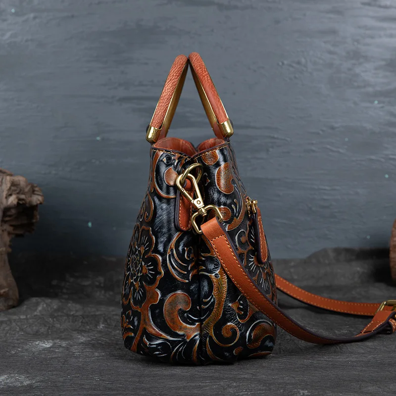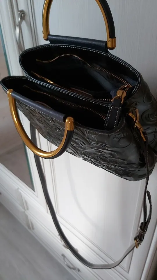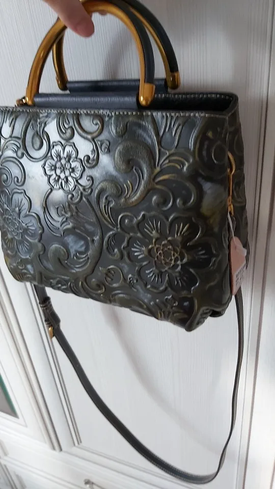 Bardzo piękna torba ze skóry bydlęcej, ręcznie robiona, bez skazy. Świetna, bezpieczna przed kradzieżą. Posiada dwie odrębne kieszenie zapinane na suwak. Wewnątrz jednej dwie otwarte kieszenie, segregatory na komórkę i inne drobiazgi, a w drugiej zasuwana na suwak mniejsza. Wygodna torebka, nie jest zbyt duża, a jednak wszystko się w niej mieści. Elegancko wykończona z okuciami na rączkach. Pięknie połączone zapięcia z długim regulowanym paskiem. Cudny wzór. Torba pasuje do wszystkiego. .Jestem zakochana w tej torebce i dziękuję sprzedawcy.