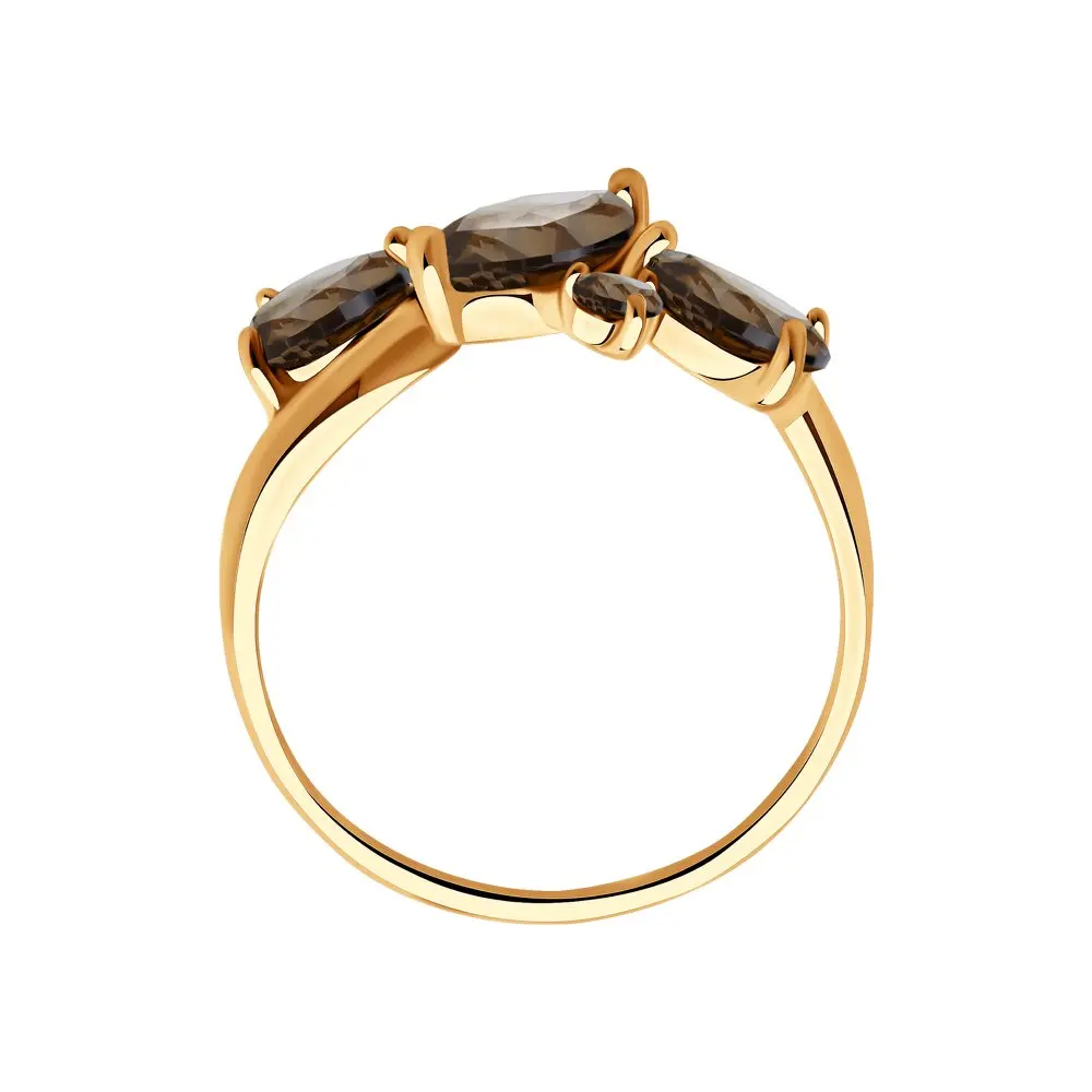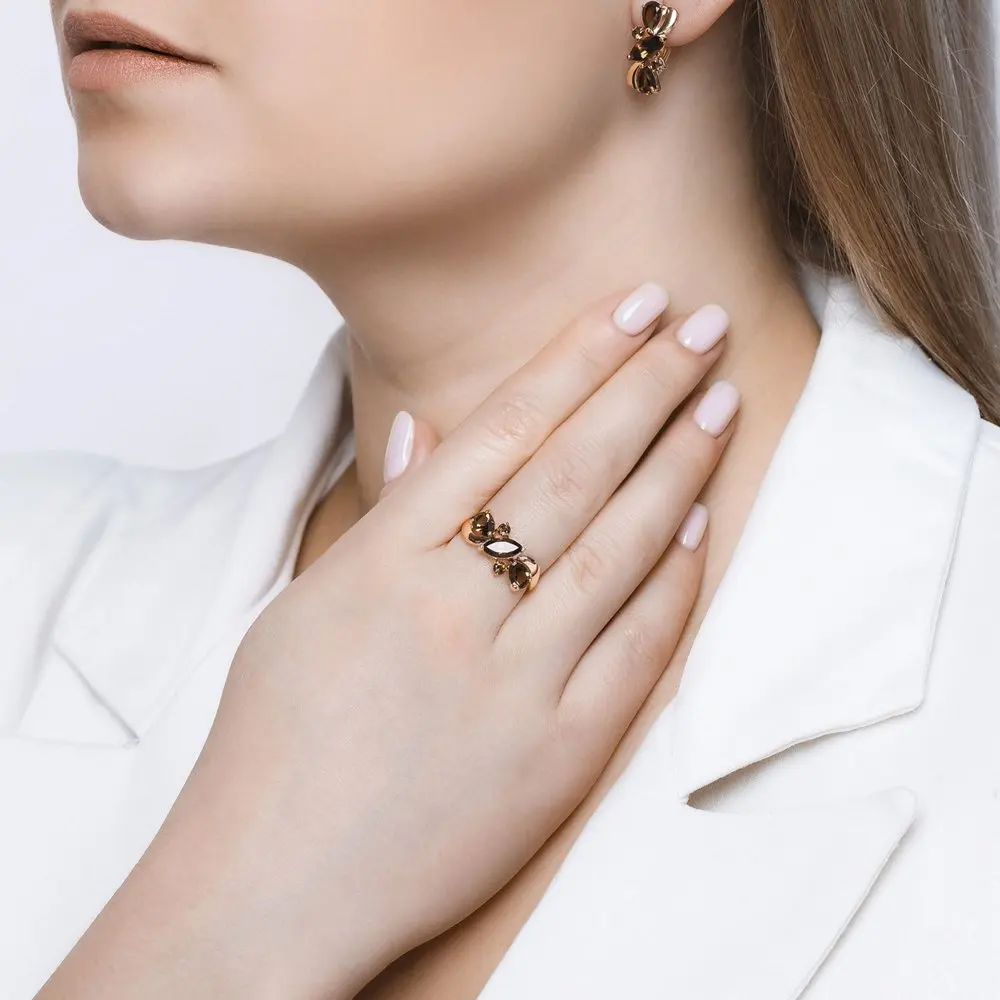 Кольцо SOKOLOV из золочёного серебра с раухтопазамиРоскошное кольцо из золочёного серебра с раухтопазами не оставит равнодушной ни одну девушку. Благородное сочетание золотых переливов металла и манящего шоколадного оттенка камней влюбляет с первого взгляда. Чтобы добавить элегантности в повседневный образ, носите украшение сольно. А если хотите устроить максимально эффектную самопрезентацию, надевайте его вечером в дуэте с серьгами аналогичного дизайна.