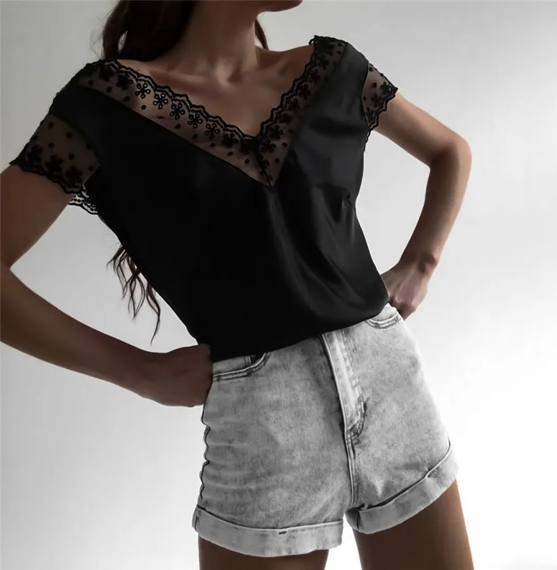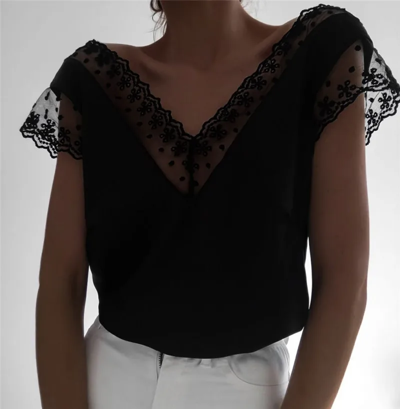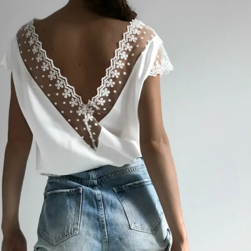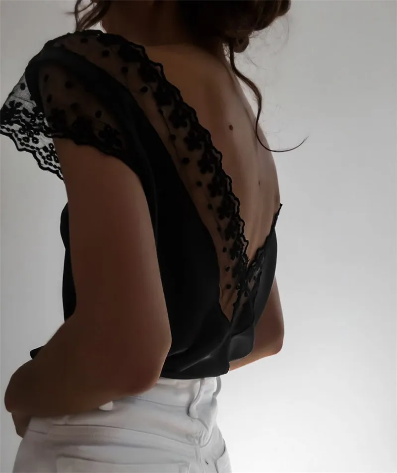 Летняя рубашка с открытой спиной, топы для женщин, сексуальная Кружевная блуза с открытой спиной, короткий рукав, глубокий v-образный вырез, кружевная Цветочная Клубная повседневная одежда, Blusa 2020