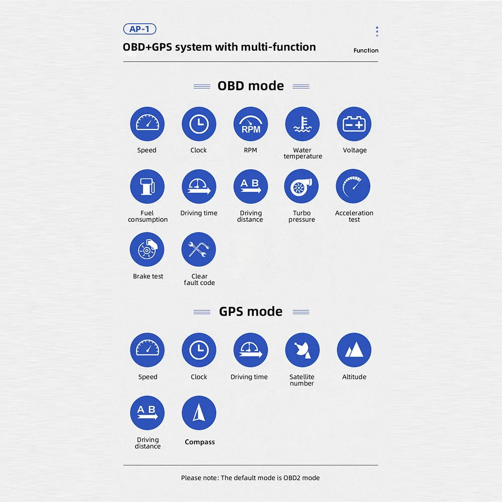 1. Отображение информации о режиме OBD: скорость транспортного средства, температура воды, температура масла, напряжение, расход топлива, об/мин, один пробег, общий совокупный пробег, время в пути, системное время, давление впуска, соотношение воздуха и топлива, давление турбины, давление впуска, испытание на ускорение, испытание тормозов, считывание потока данных. Сигнал тревоги: сигнал тревоги о превышении скорости, сигнал тревоги скорости, сигнал тревоги о высокой температуре воды, сигнал тревоги низкого напряжения, сигнал тревоги о неисправности двигателя, четкий код неисправности, свободное переключение между километром и милями, переключатель Цельсия и Фаренгейта свободно. 2. Отображение информации о режиме GPS: скорость, время в пути, Спутниковое время, высота, количество спутников, направление движения, один пробег, напряжение, испытание на ускорение, испытание тормозов. Сигнализация: сигнализация с превышением скорости, сигнализация с низким напряжением, свободное переключение между километром и милями.
