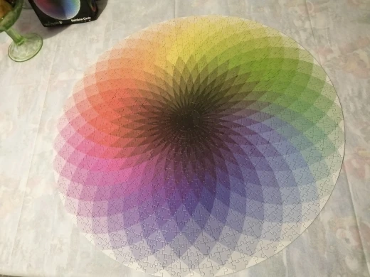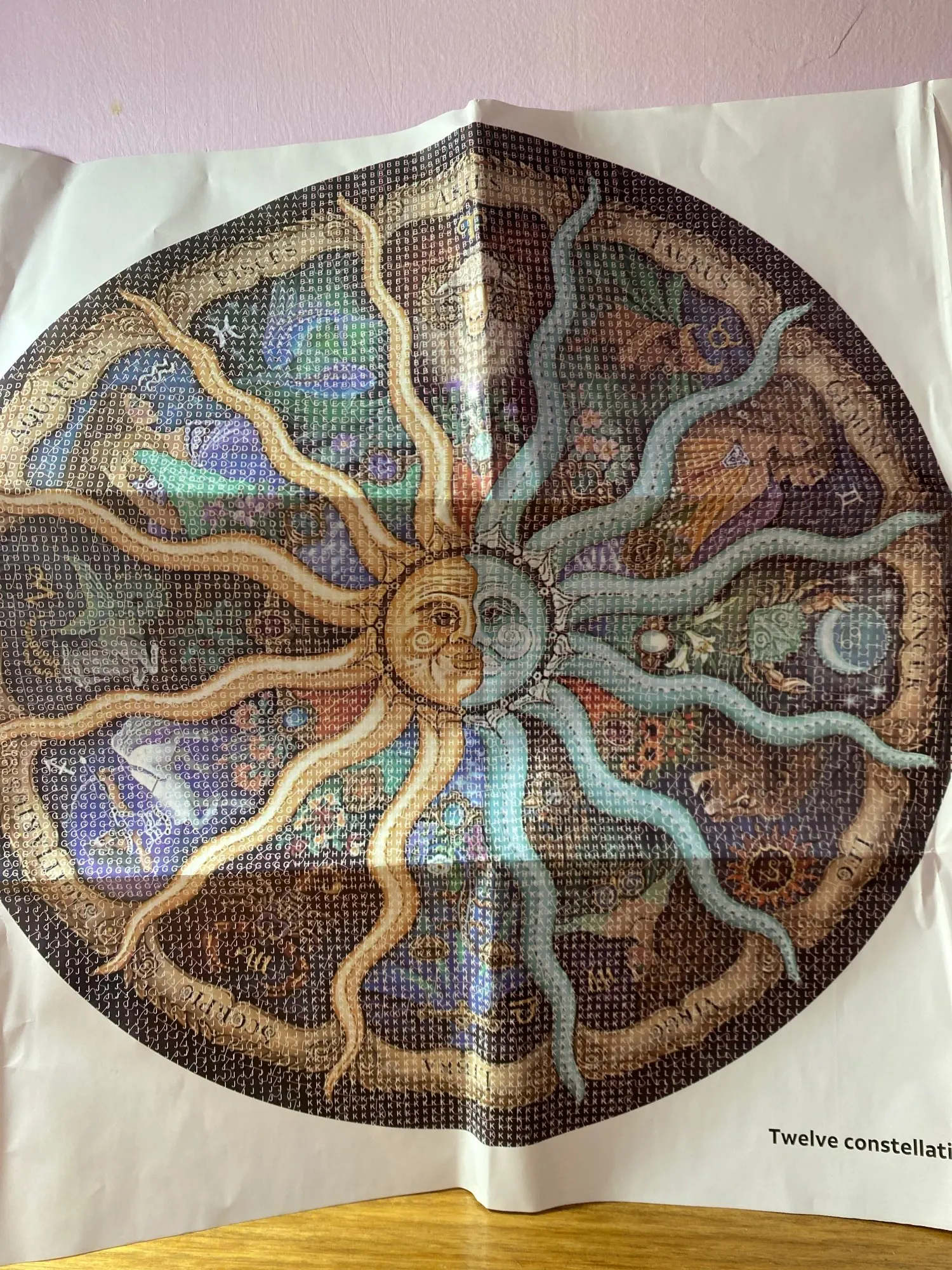 За месяц в Ленинградскую область. Коробка, хоть и упакована очень хорошо, мятая. Внутри есть инструкция с расположением деталей, но она не везде совпадает. С обратной стороны поделена на области (буквами). Качество картона не очень хорошее, тоньше, чем обычная качественная мозаика. Собрала меньше, чем за 1 день.