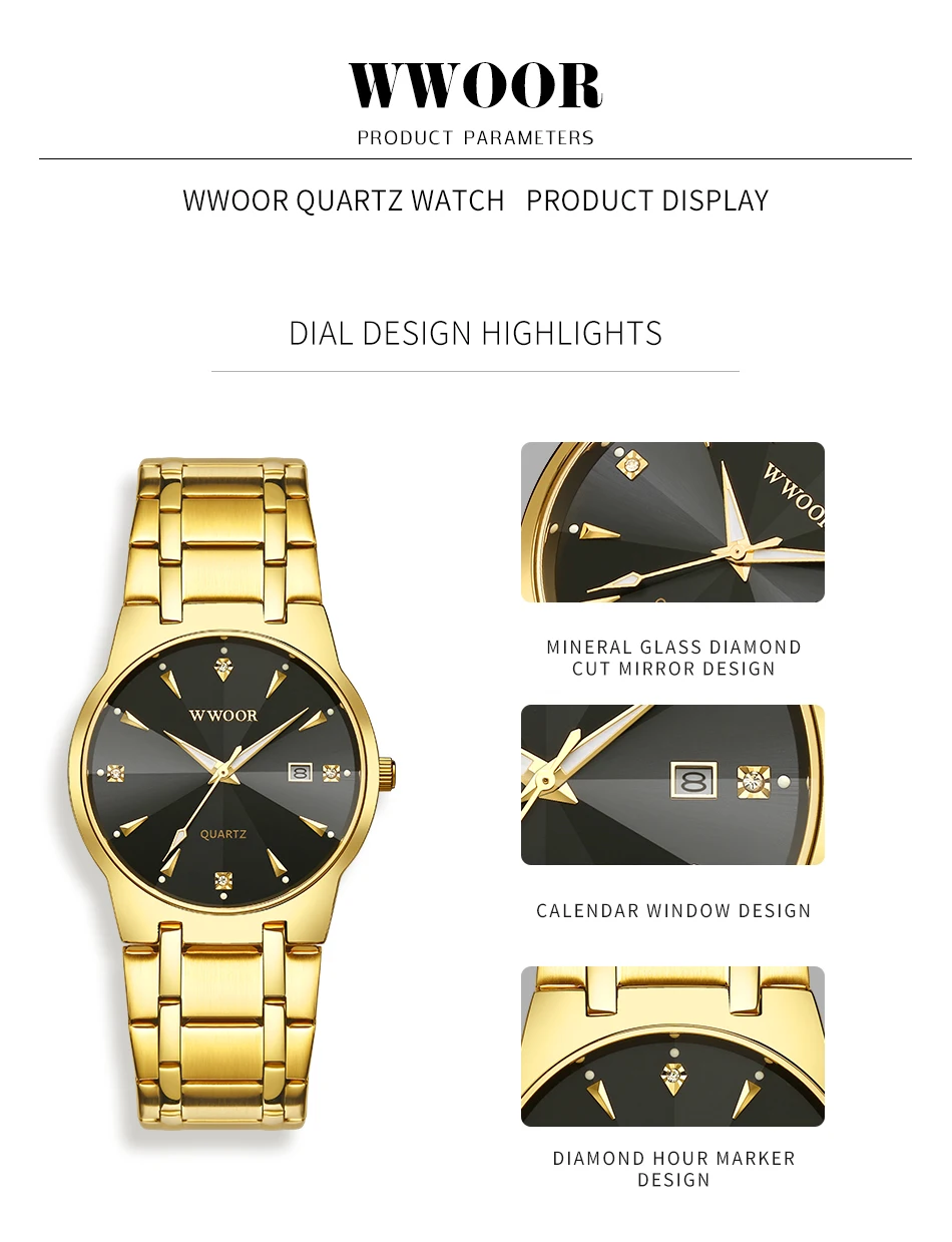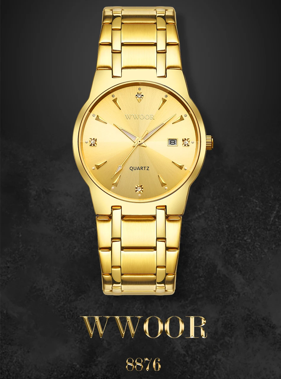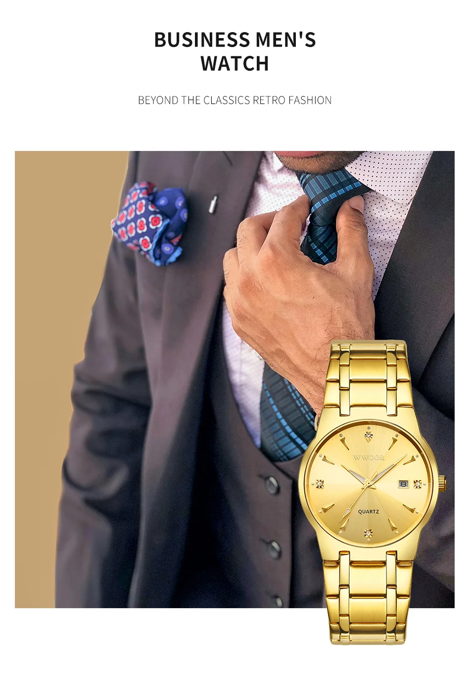 Часы наручные WWOOR Мужские кварцевые, брендовые Роскошные спортивные деловые золотистые, со стразами, новинка 2021