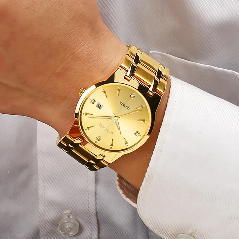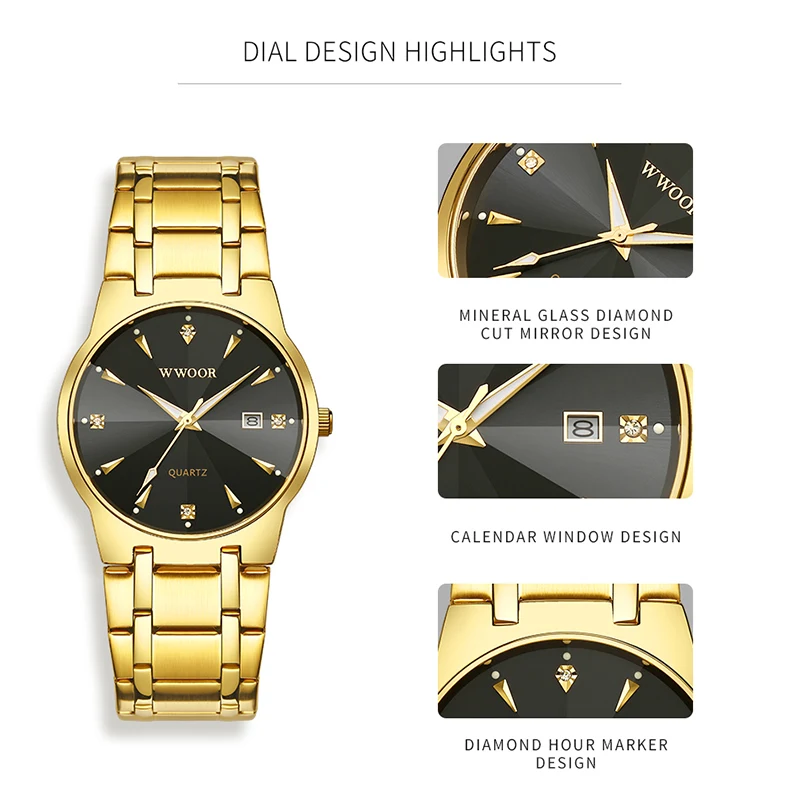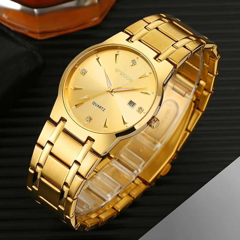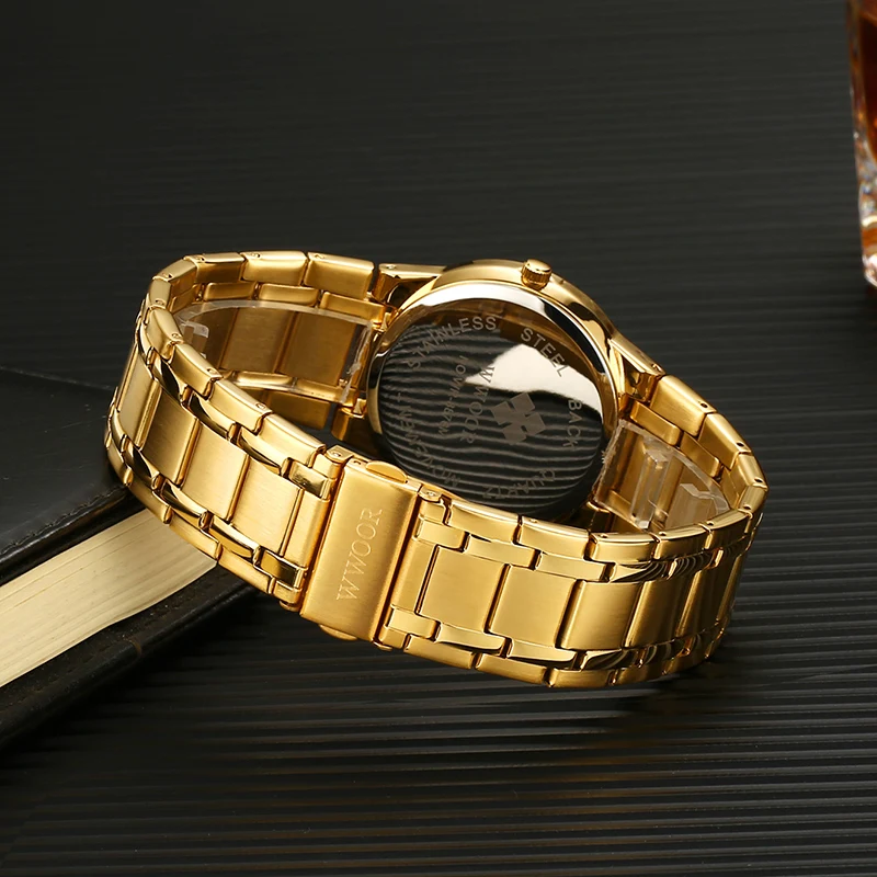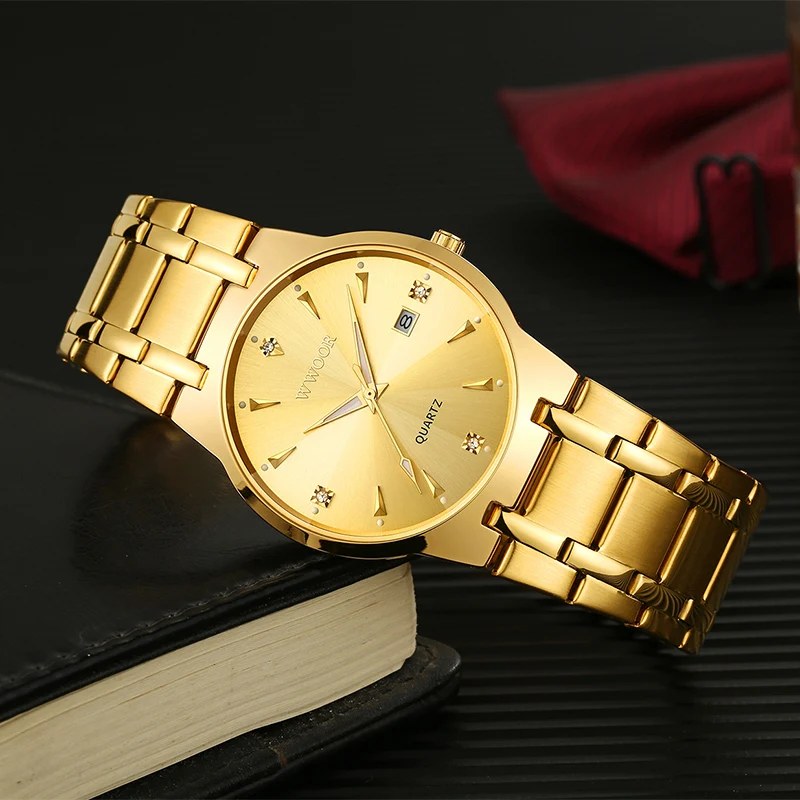 Часы наручные WWOOR Мужские кварцевые, брендовые Роскошные спортивные деловые золотистые, со стразами, новинка 2021