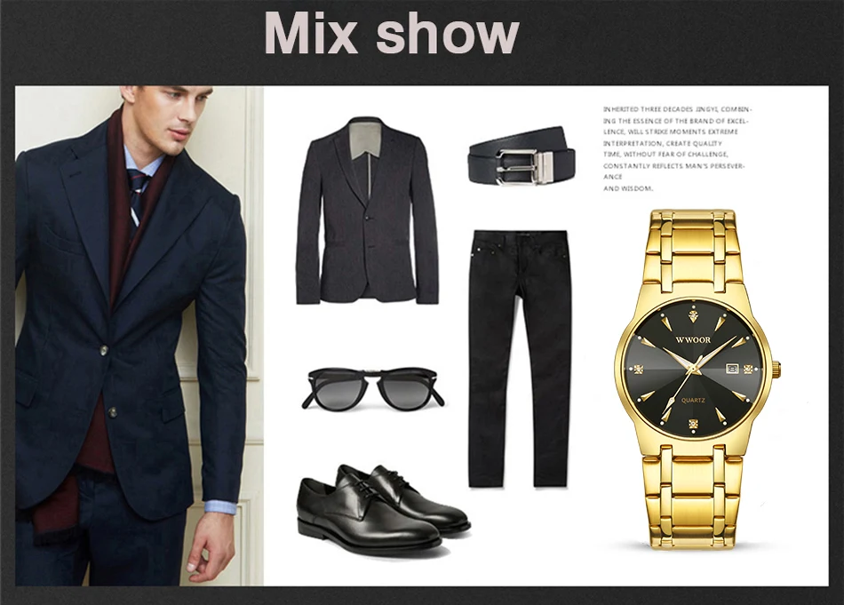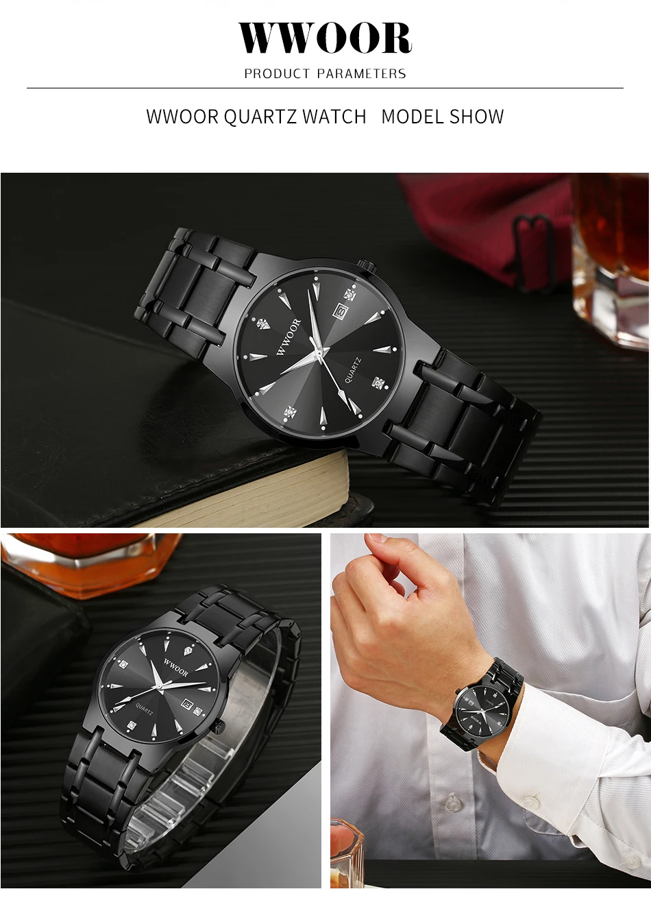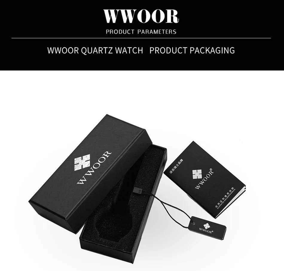 -1 x WWOOR Мужские Роскошные наручные часы;-1 подарочная коробка WWOOR;-1 x чистая ткань-1 x регулятор ремешка (вы можете регулировать длину ремешка часов самостоятельно, не нужно ходить в магазин часов)