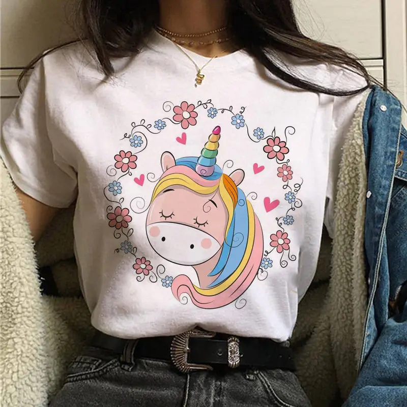 Футболка женская с круглым вырезом, Повседневная Уличная одежда в стиле ольчзан, Харадзюку, с мультяшным принтом единорога, в Корейском стиле