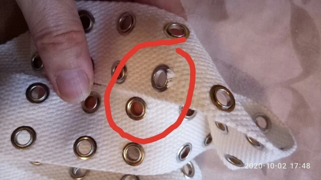 Доставка в Украину 08.09-02.10. Пояс широкий, визуально супер. Но качество постановки заклепок оставляет желать лучшего. На фото видно, что из-под некоторых заклепок (я насчитала на моем поясе таких 13) вылезают нитки краев пробитых дырок. По опыту знаю, что через неделю-две носки ткань под заклепками начинает сотаться и заклепки со временем выпадают. Очень жаль. Пояс получился на один сезон.